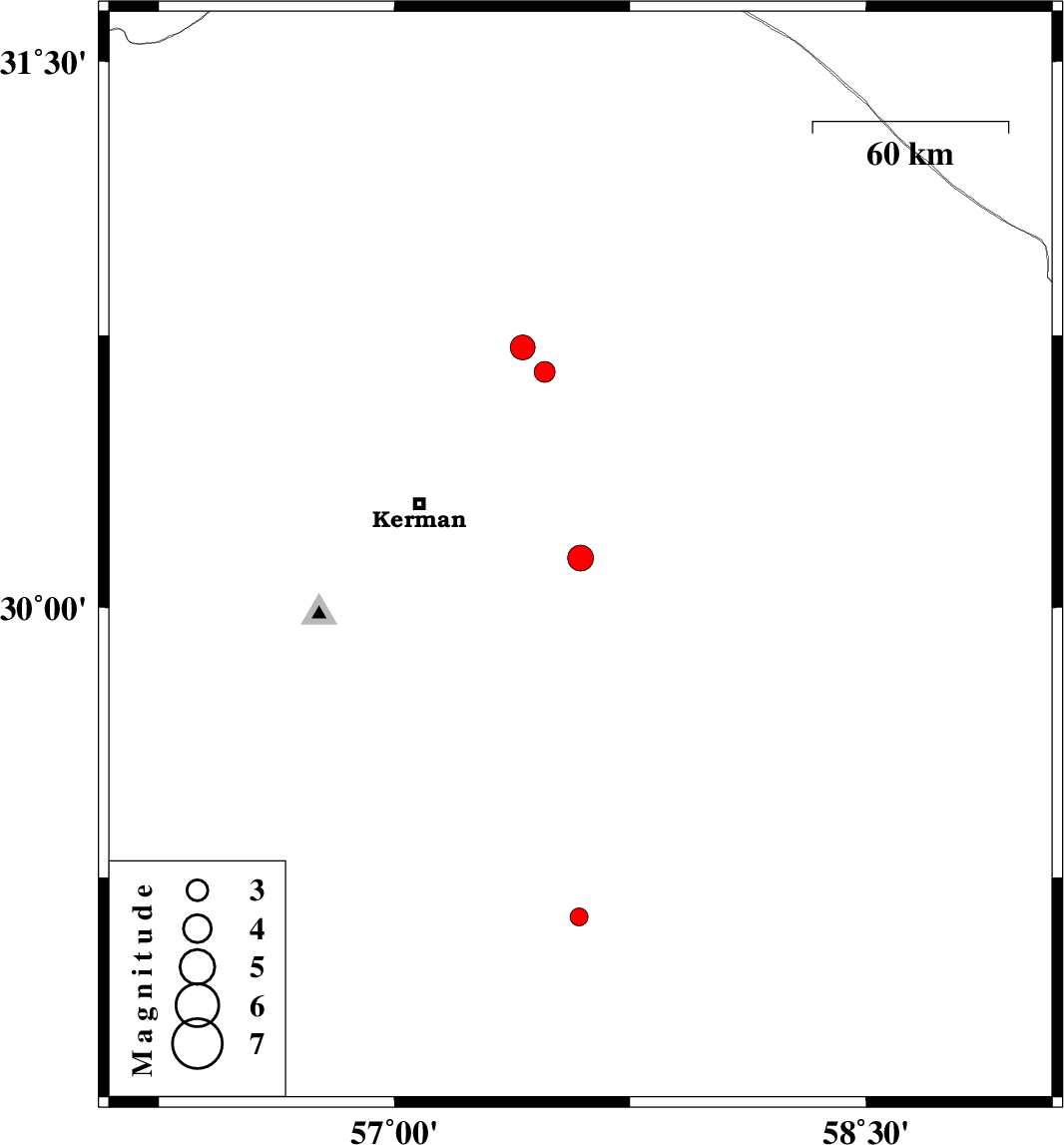 | 2017/11/18 | 07:28:38.4 | 10:58:38.4 | 30.137 | 57.592 | 15 | ML:3.6 | Kerman Province, 52 km South-East of Kerman | ||