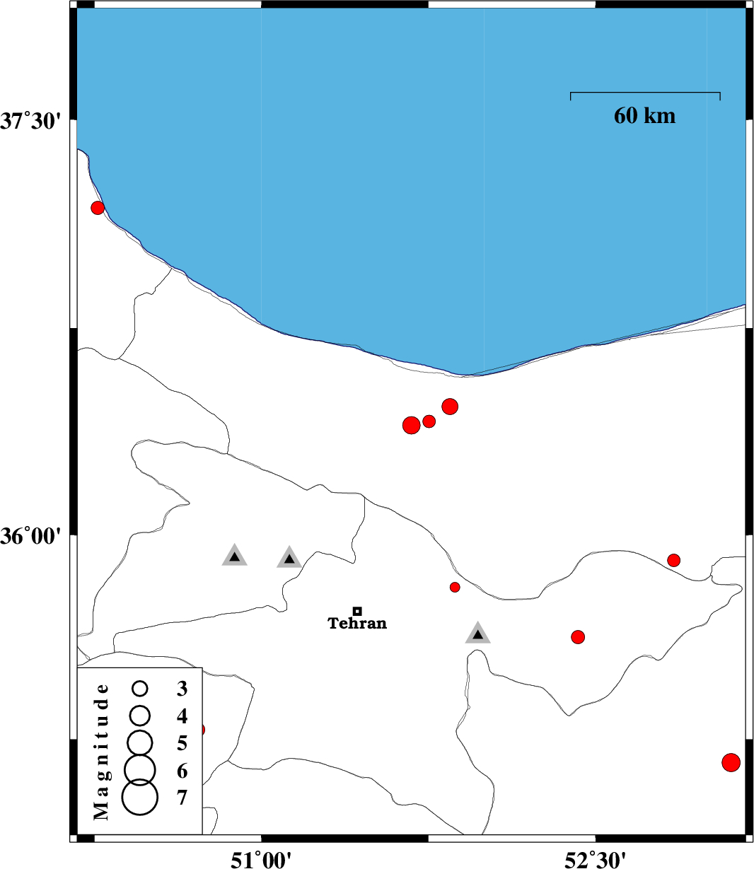 | 2017/10/31 | 03:46:37.2 | 07:16:37.2 | 36.412 | 51.752 | 6 | ML:2.5 | Mazandaran Province, 31 km South-West of Nur | ||