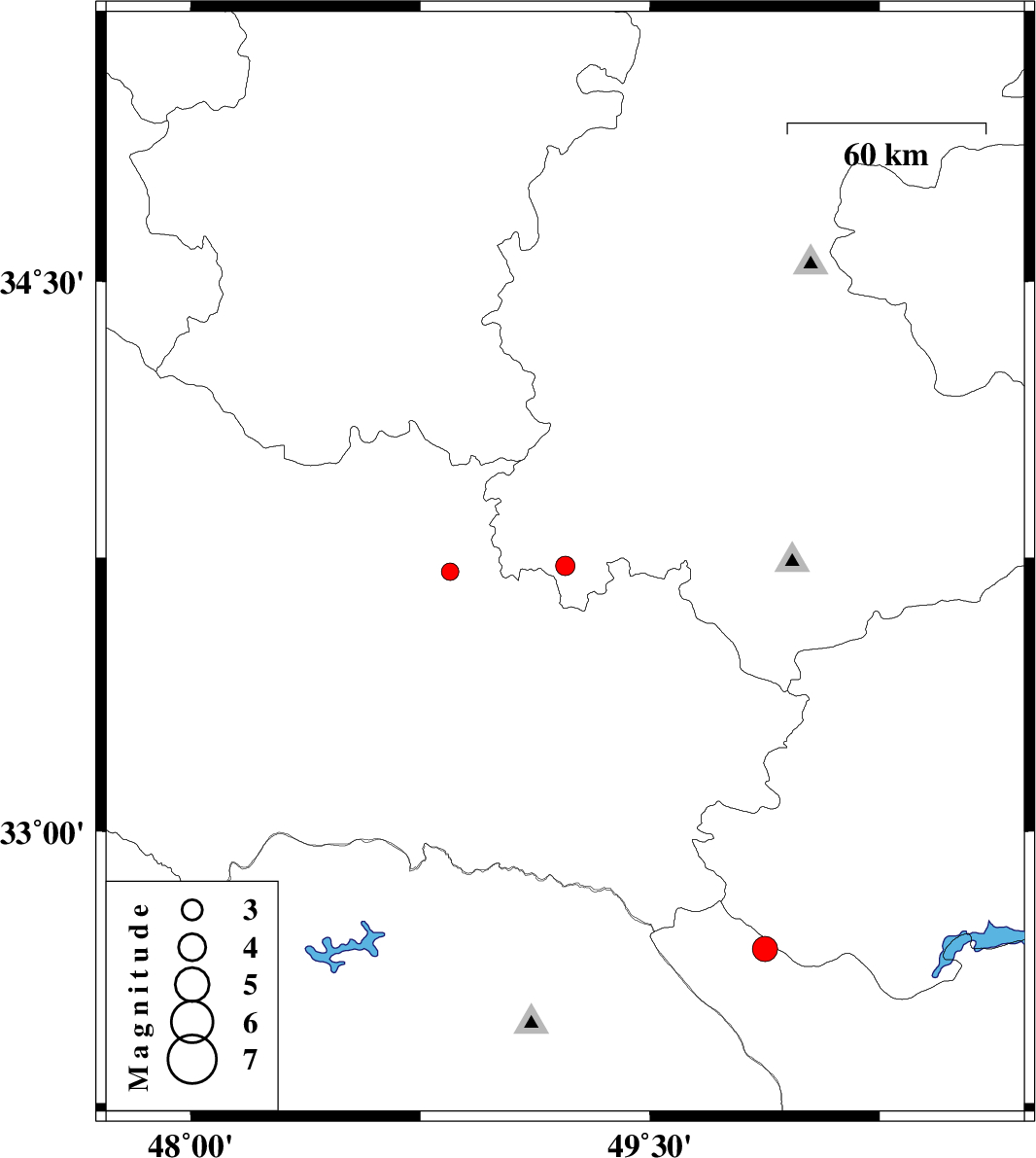 | 2017/11/12 | 19:20:09.5 | 22:50:09.5 | 33.728 | 49.223 | 6 | ML:2.8 | Markazi Province, 28 km South-West of Shazand | ||