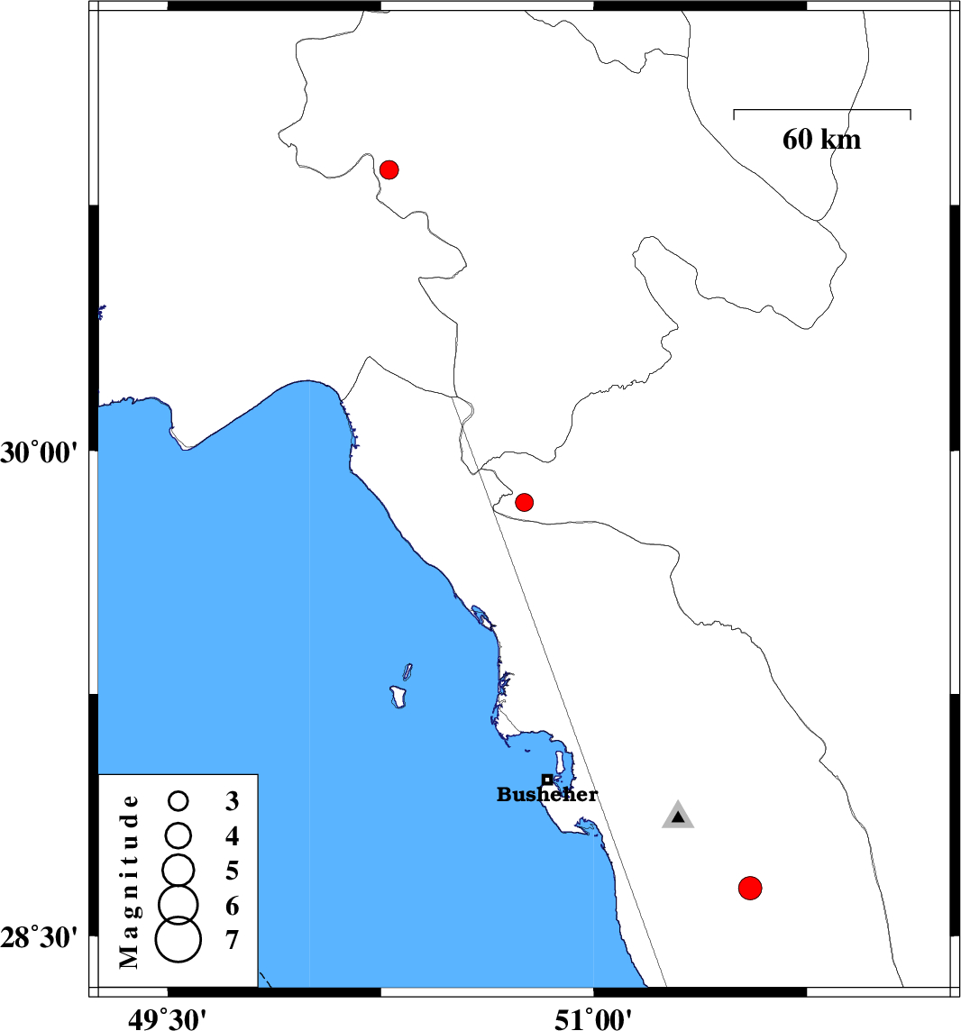| 2017/11/14 | 04:15:21.3 | 07:45:21.3 | 29.84 | 50.755 | 14 | ML:2.8 | Fars Province, 38 km North-East of Bandar-e genaveh | ||