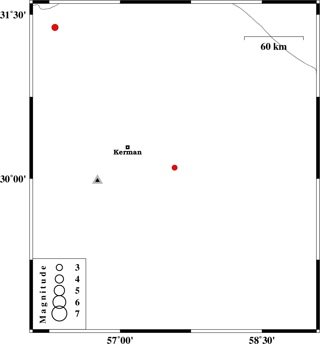 | 2017/11/27 | 01:56:22.0 | 05:26:22.0 | 30.1 | 57.576 | 14 | ML:2.6 | Kerman Province, 52 km South-East of Kerman | ||