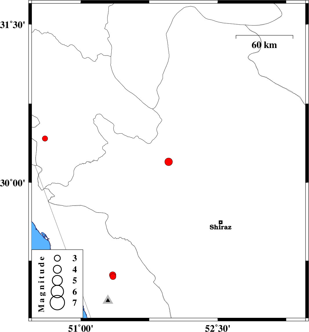 | 2017/11/29 | 16:52:46.8 | 20:22:46.8 | 29.097 | 51.353 | 14 | ML:3 | Bushehr Province, 23 km South-East of Borazjan | ||