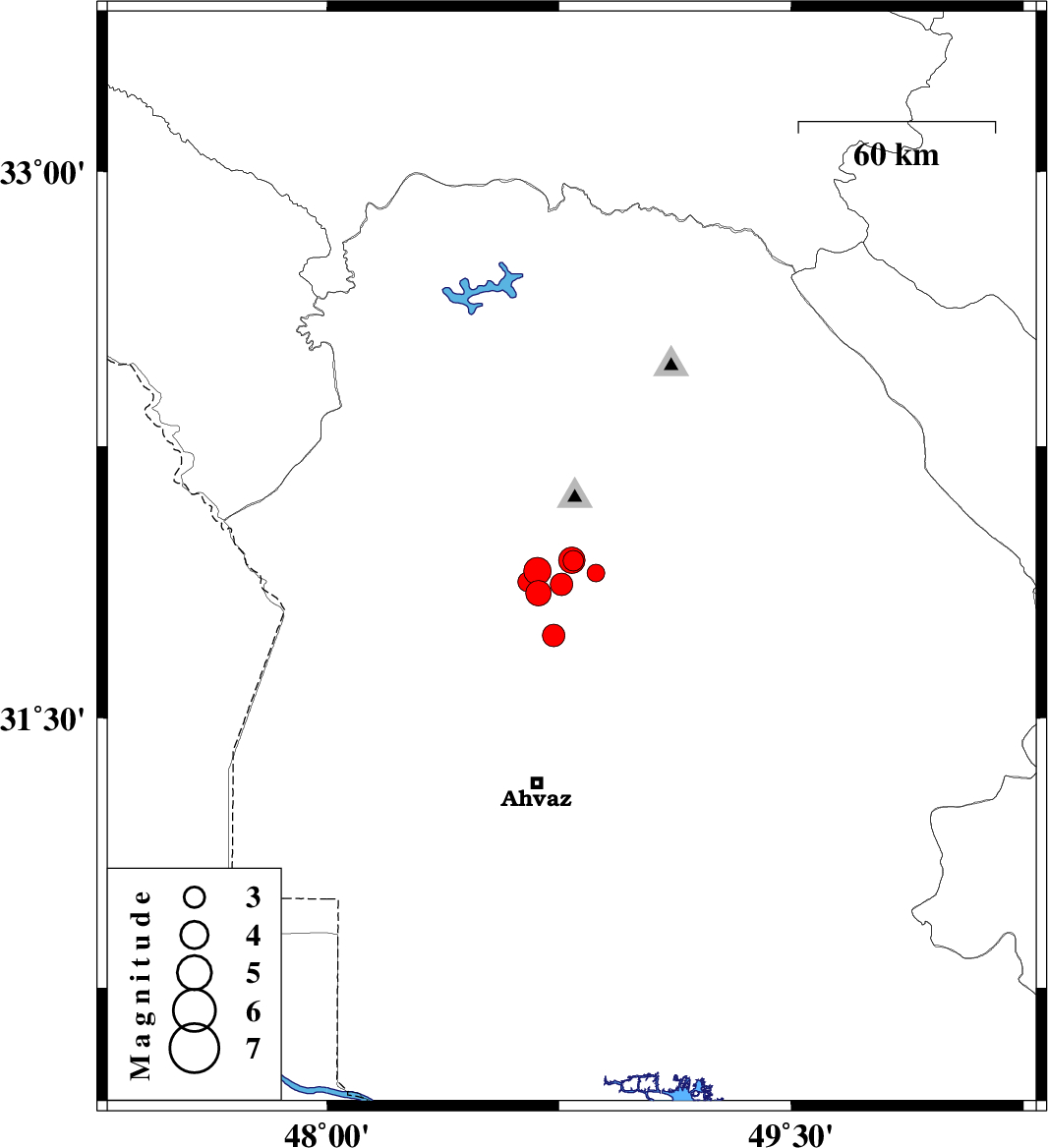 | 2017/12/30 | 07:48:20.3 | 11:18:20.3 | 31.845 | 48.683 | 15 | ML:3.7 | Khoozestan Province, 27 km South-West of Shushtar | ||