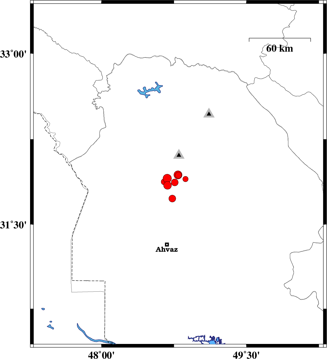 | 2017/12/30 | 07:48:20.3 | 11:18:20.3 | 31.845 | 48.683 | 15 | ML:3.7 | Khoozestan Province, 27 km South-West of Shushtar | ||