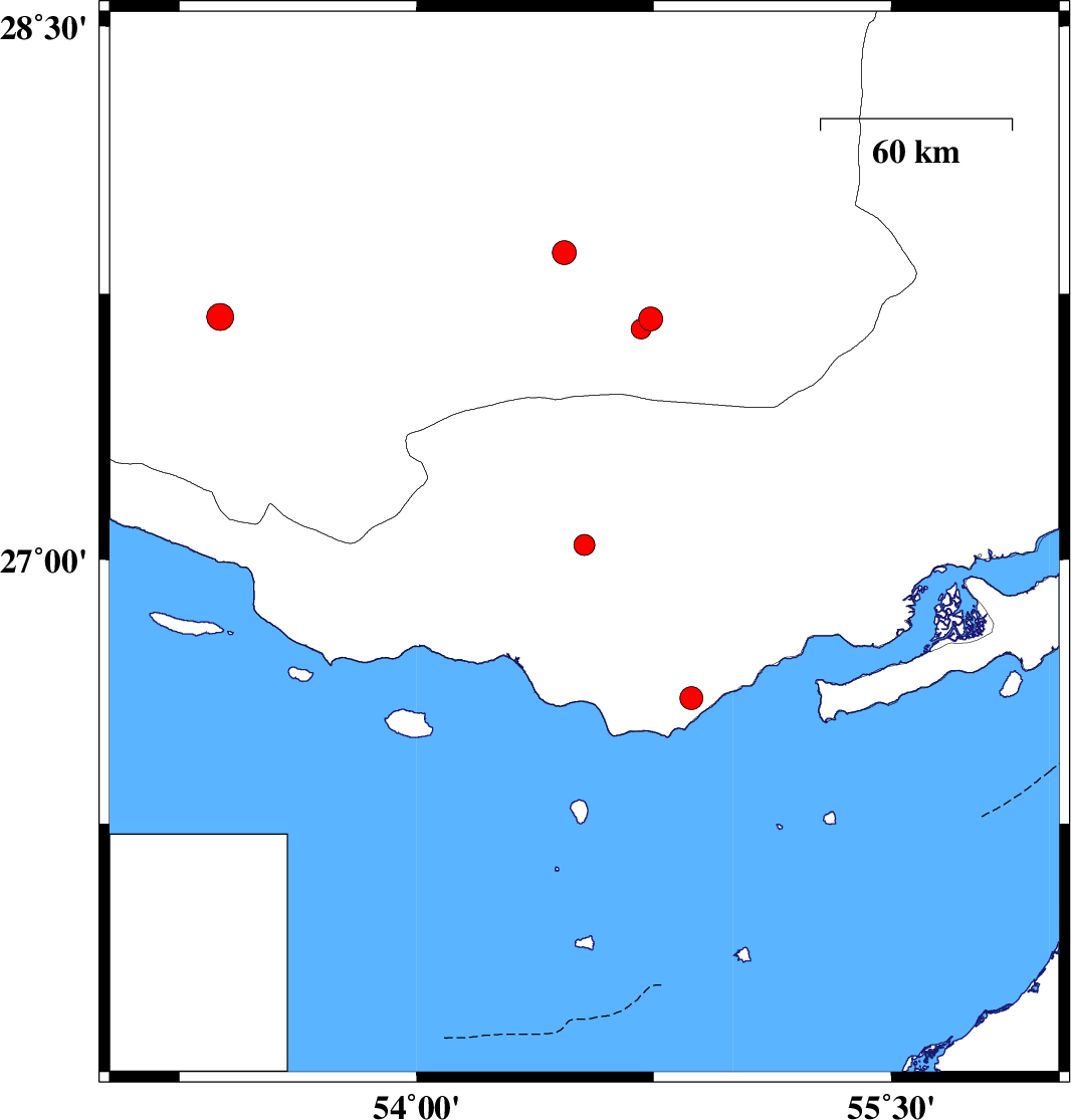 | 2017/12/09 | 02:08:46.1 | 05:38:46.1 | 27.651 | 54.71 | 14 | ML:2.8 | Fars Province, 37 km -East of Lar |