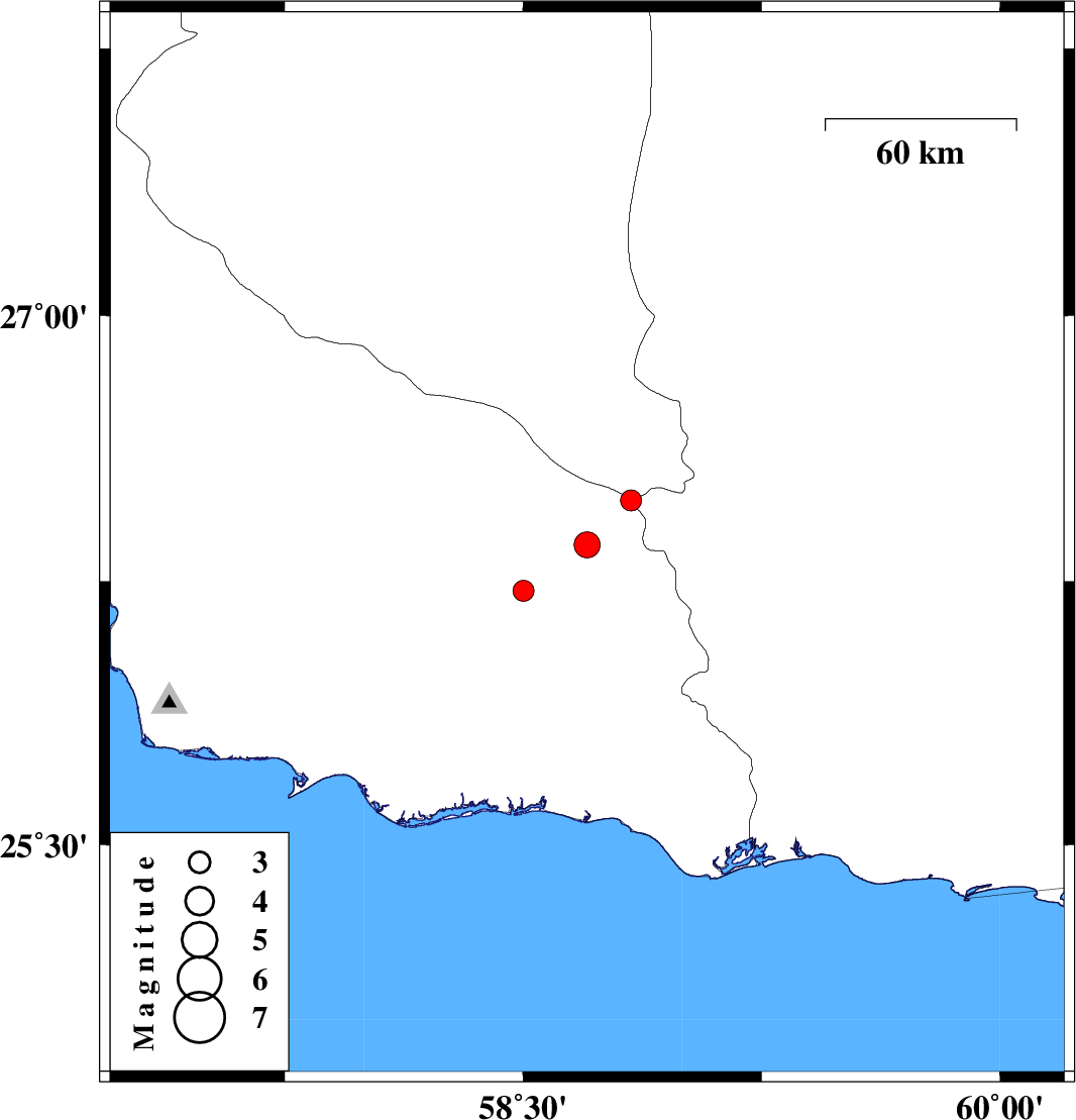 | 2018/01/04 | 23:47:22.3 | 03:17:22.3 | 26.353 | 58.701 | 18 | ML:3.6 | Hormozgan Province, 151 km North-West of Nikshahr | ||