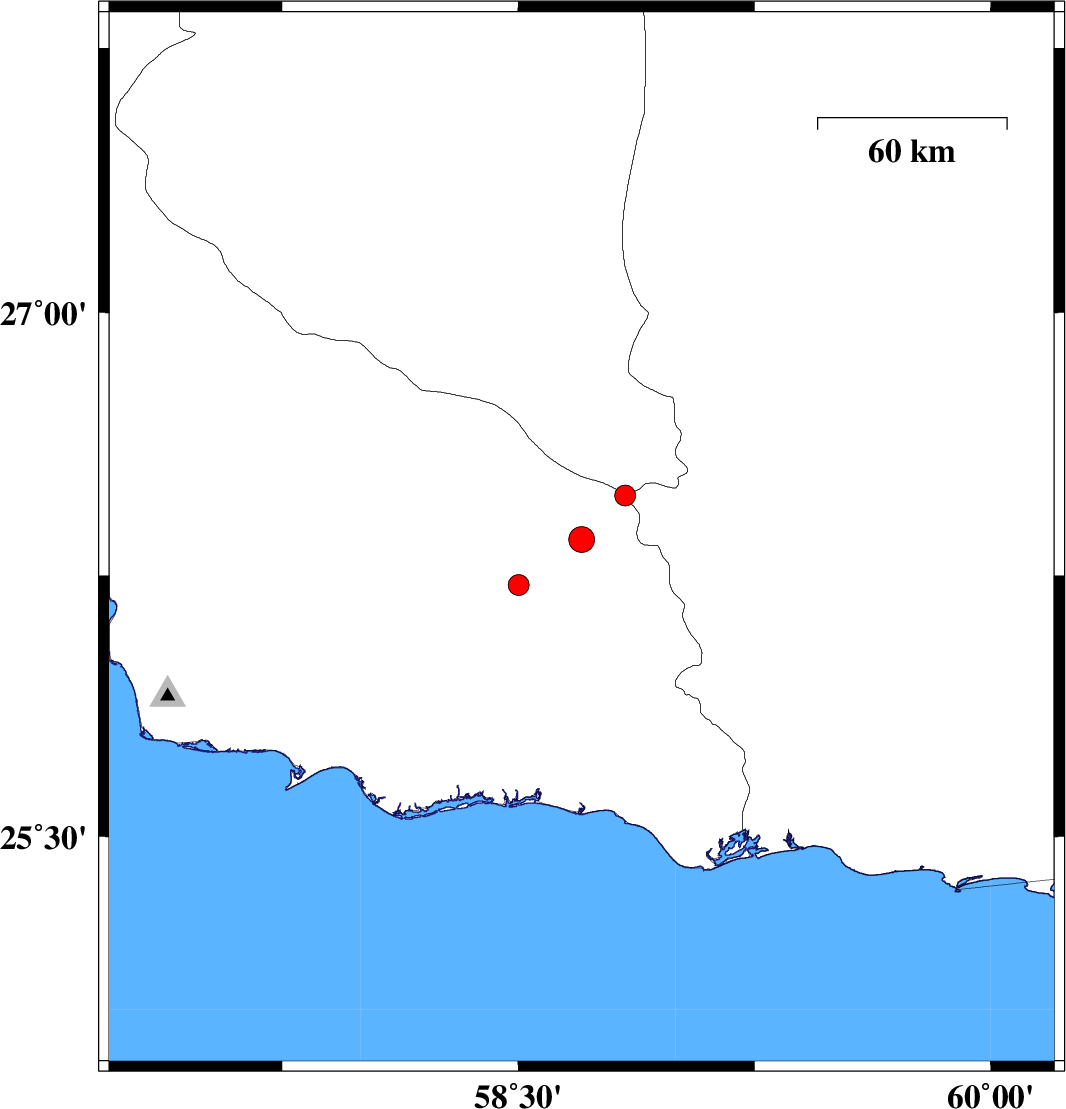 | 2018/01/04 | 23:47:22.3 | 03:17:22.3 | 26.353 | 58.701 | 18 | ML:3.6 | Hormozgan Province, 151 km North-West of Nikshahr | ||