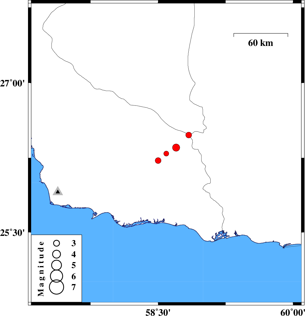 | 2018/01/04 | 23:47:22.3 | 03:17:22.3 | 26.353 | 58.701 | 18 | ML:3.6 | Hormozgan Province, 151 km North-West of Nikshahr | ||