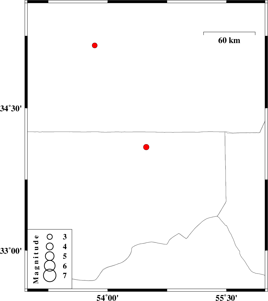 | 2018/01/15 | 16:57:53.9 | 20:27:53.9 | 34.091 | 54.487 | 14 | ML:3.3 | Esfahan Province, 231 km South-East of Damghan | ||