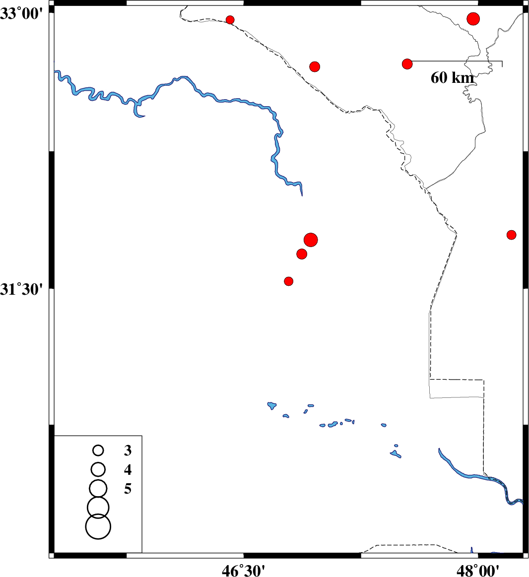 | 2018/01/15 | 22:06:37.5 | 01:36:37.5 | 31.689 | 46.871 | 14 | ML:3 | Iraq | ||