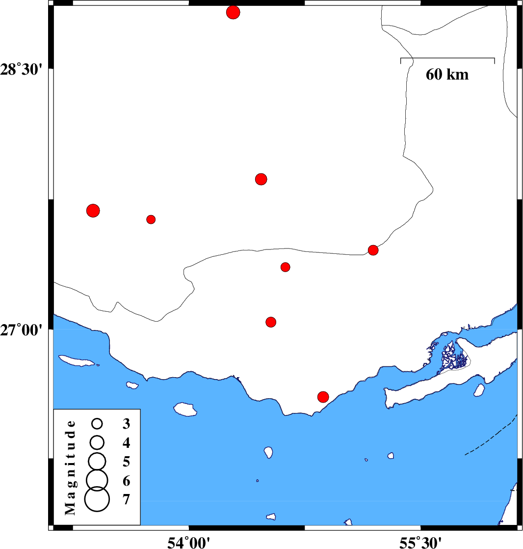 | 2017/12/24 | 10:57:15.1 | 14:27:15.1 | 27.685 | 53.379 | 14 | ML:3.8 | Fars Province, 44 km North-East of Lamerd | ||