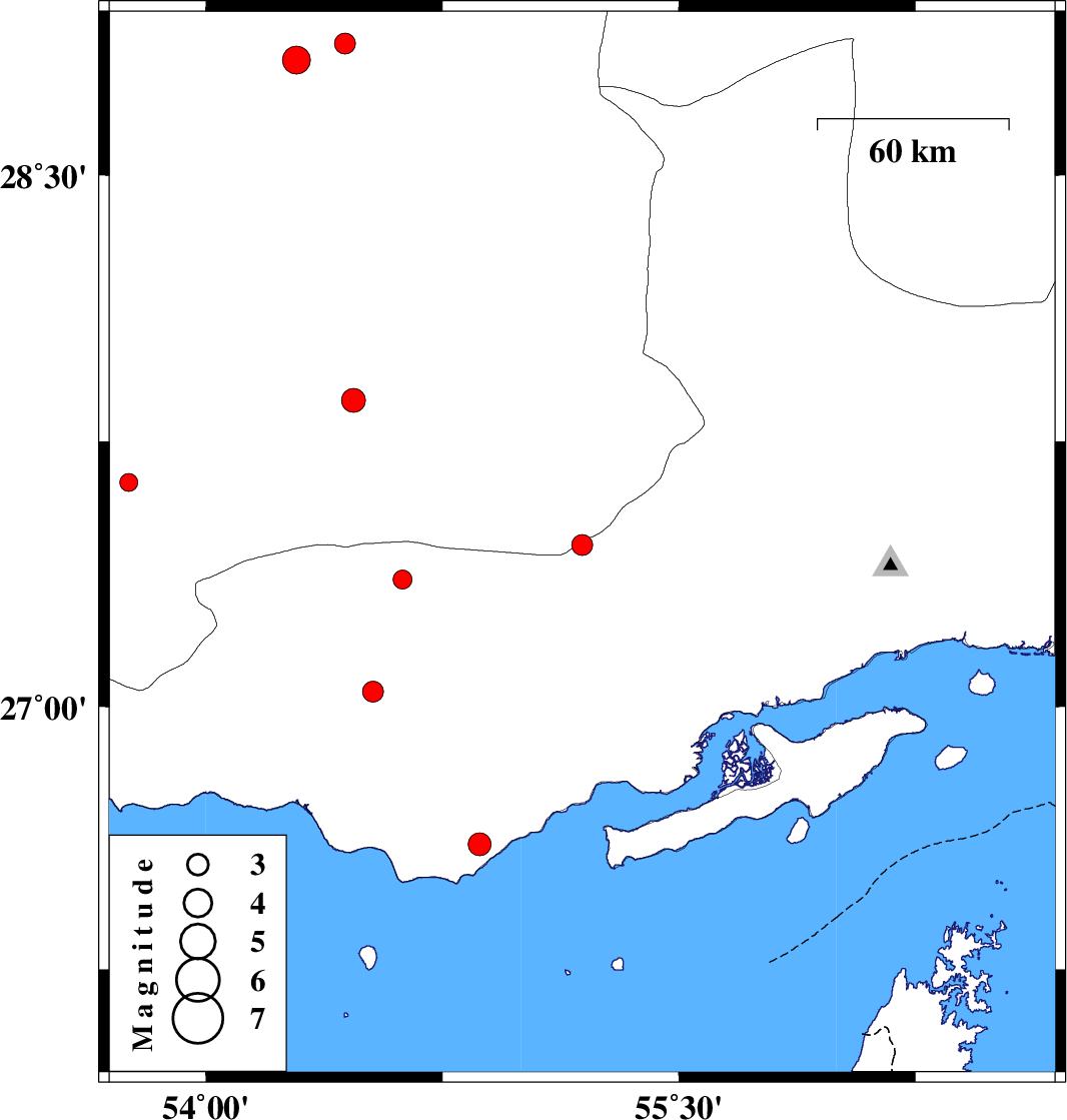 | 2017/12/19 | 06:00:35.2 | 09:30:35.2 | 28.821 | 54.286 | 17 | ML:4 | Fars Province, 26 km -West of Darab |