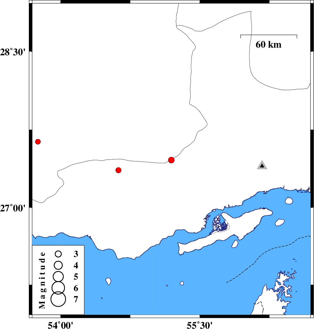 | 2018/01/13 | 01:41:30.5 | 05:11:30.5 | 27.634 | 53.755 | 14 | ML:2.5 | Fars Province, 58 km -West of Lar |