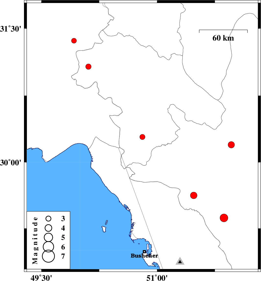 | 2018/01/09 | 08:56:39.2 | 12:26:39.2 | 29.625 | 51.475 | 15 | ML:3.9 | Fars Province, 17 km -West of Kazerun | ||