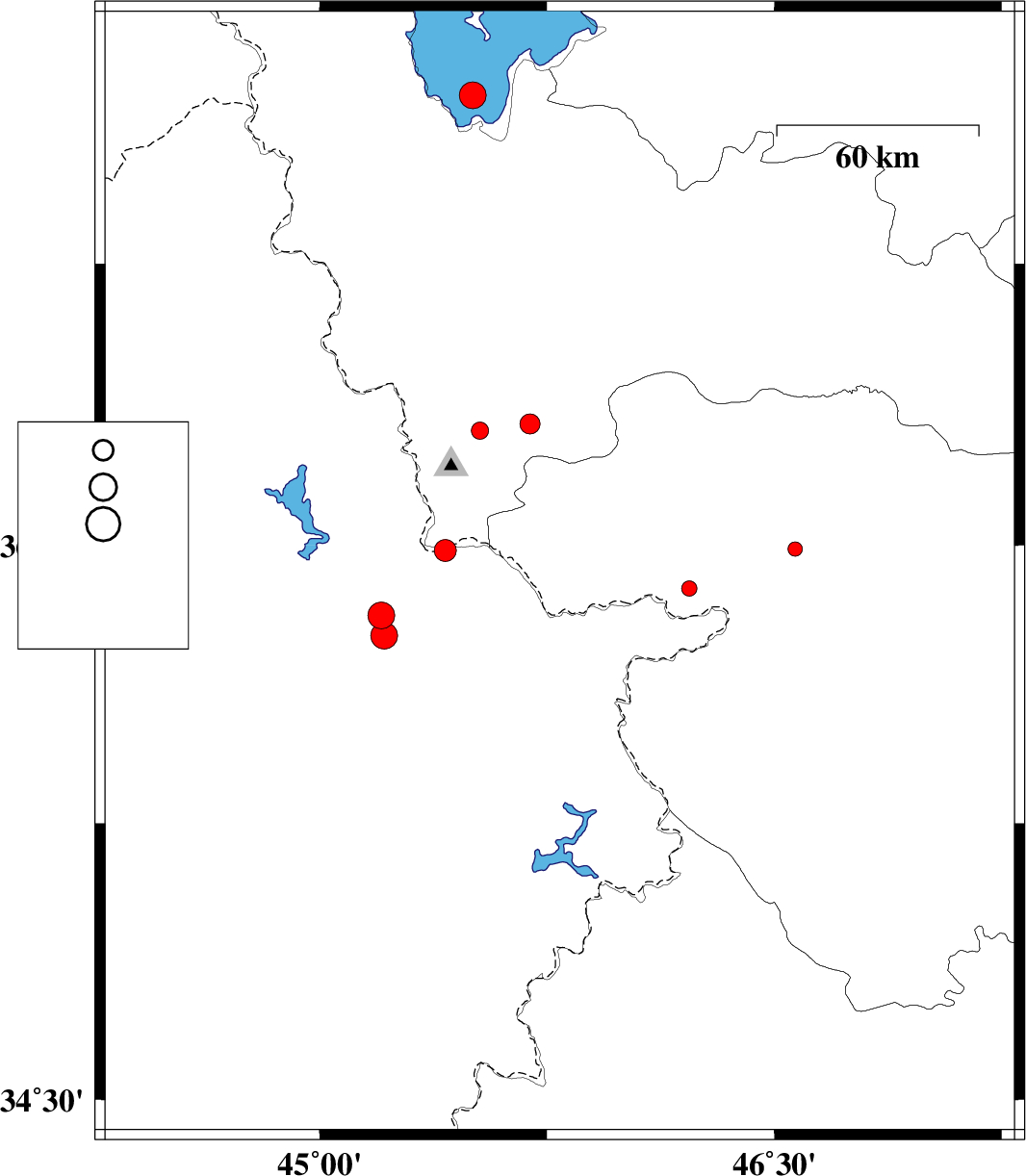 | 2018/01/21 | 15:05:55.5 | 18:35:55.5 | 34.691 | 46.855 | 8 | ML:2.1 | Kermanshah Province, 16 km South of Kamyaran | ||