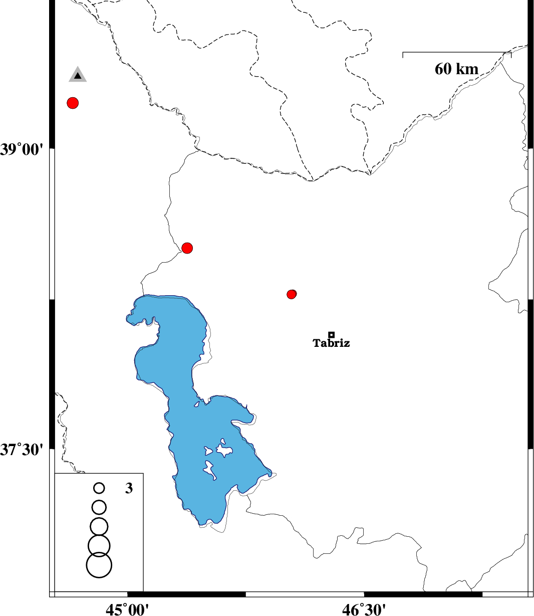 | 2018/01/22 | 15:59:16.9 | 19:29:16.9 | 38.278 | 46.046 | 14 | ML:2.2 | Azarbaijan Sharghi Province, 29 km South-East of Marand | ||