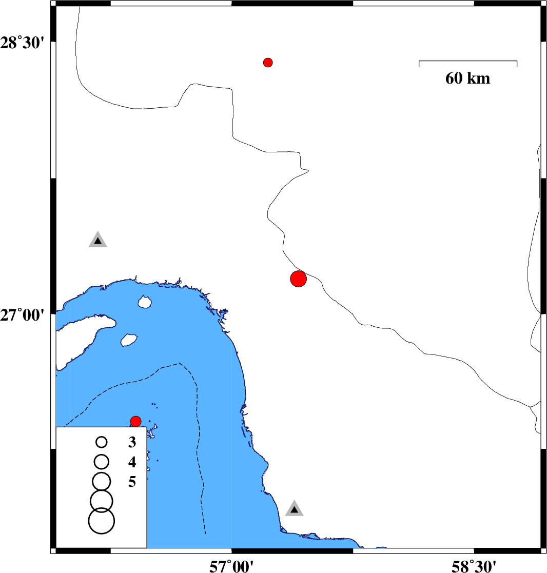 | 2018/01/23 | 04:33:20.4 | 08:03:20.4 | 26.402 | 56.405 | 6 | ML:3 | Persian Gulf, 63 km South-East of Qeshm | ||