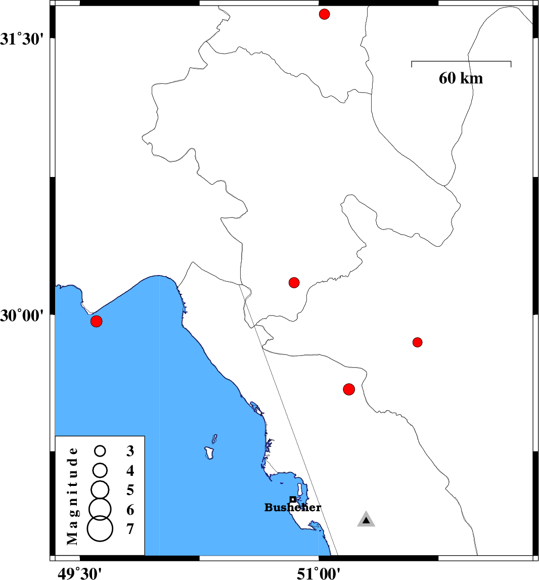| 2018/01/22 | 13:37:12.5 | 17:07:12.5 | 29.591 | 51.188 | 15 | ML:3.3 | Bushehr Province, 37 km North of Borazjan |