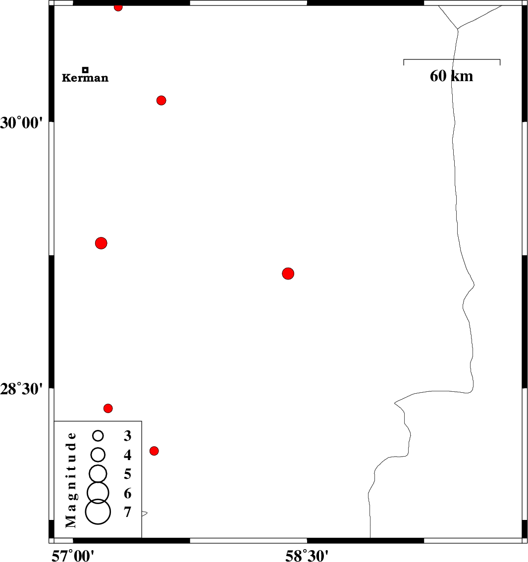 | 2018/01/03 | 18:09:21.5 | 21:39:21.5 | 29.319 | 57.18 | 14 | ML:3.4 | Kerman Province, 56 km -East of Baft |