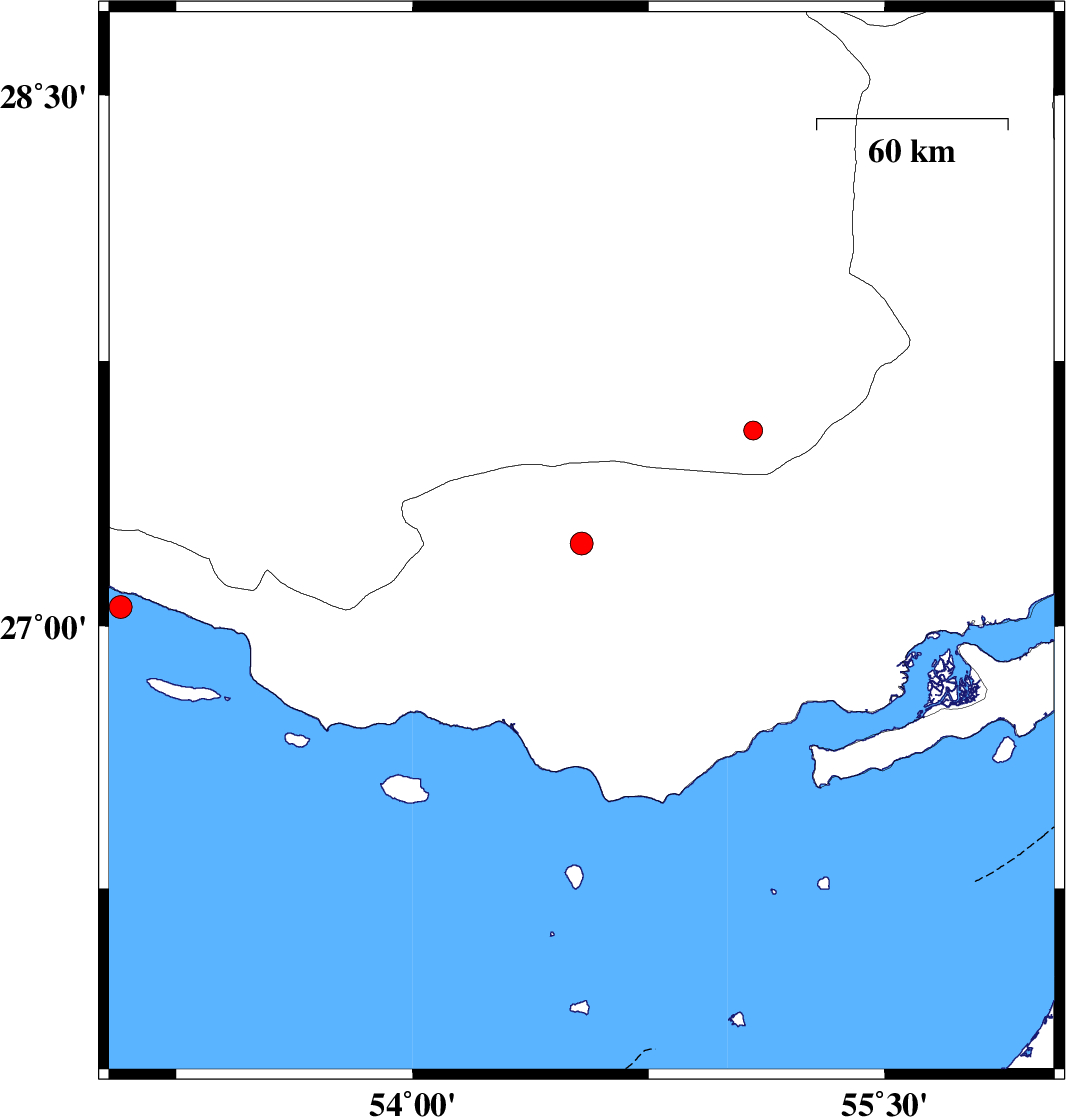 | 2018/01/31 | 23:29:46.5 | 02:59:46.5 | 27.054 | 53.073 | 16 | ML:3.2 | Persian Gulf, 32 km South of Lamerd |