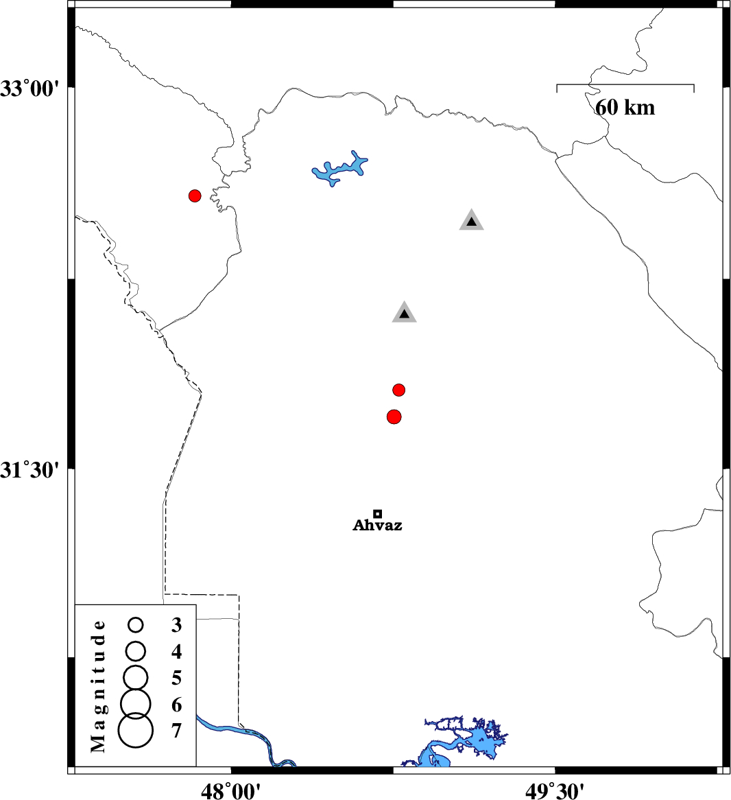 | 2018/02/02 | 00:45:19.7 | 04:15:19.7 | 31.811 | 48.776 | 14 | ML:2.6 | Khoozestan Province, 27 km South of Shushtar | ||