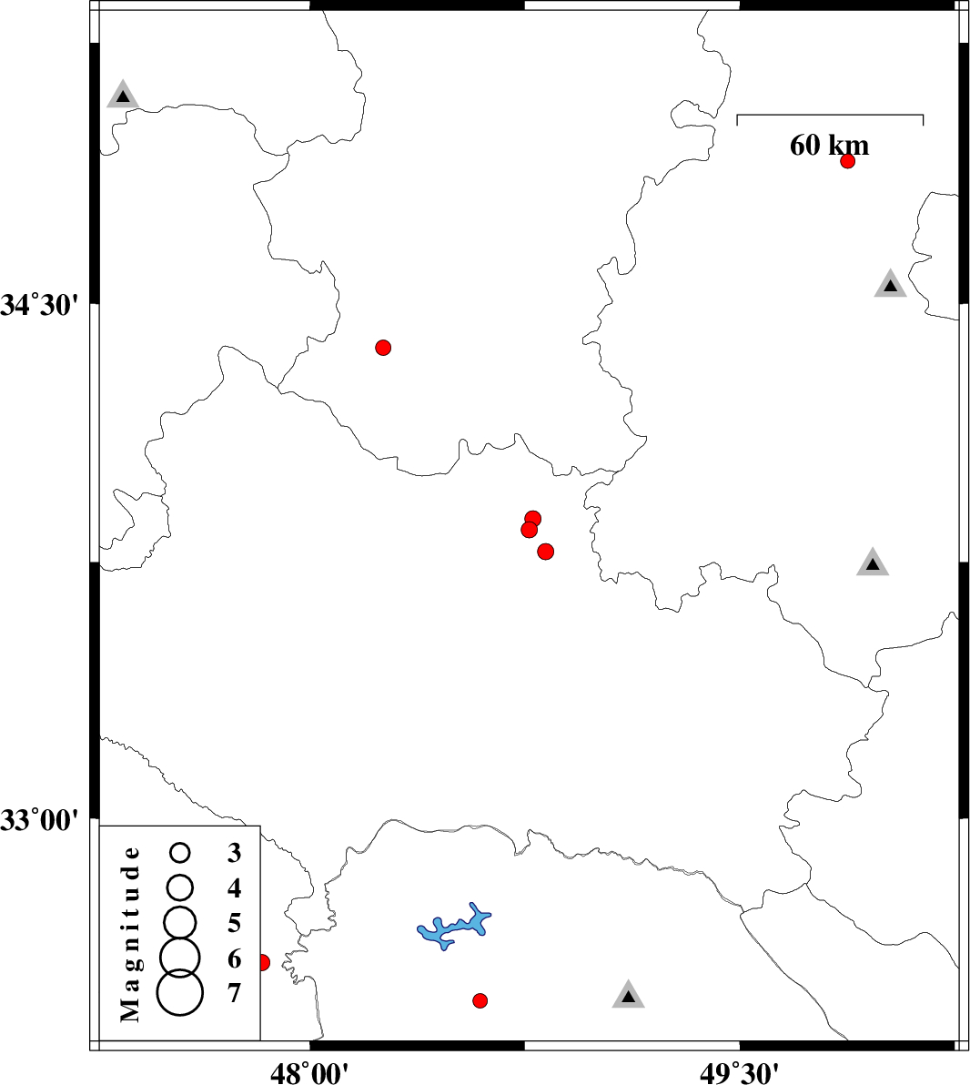 | 2018/01/04 | 04:40:17.9 | 08:10:17.9 | 33.781 | 48.822 | 9 | ML:2.6 | Lorestan Province, 14 km South of Borujerd |