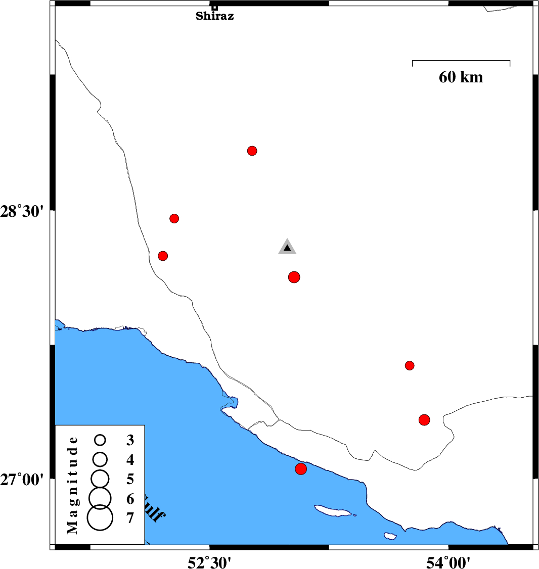 | 2018/01/29 | 07:08:42.9 | 10:38:42.9 | 28.828 | 52.766 | 14 | ML:2.7 | Fars Province, 17 km -East of Firuz Abad | ||