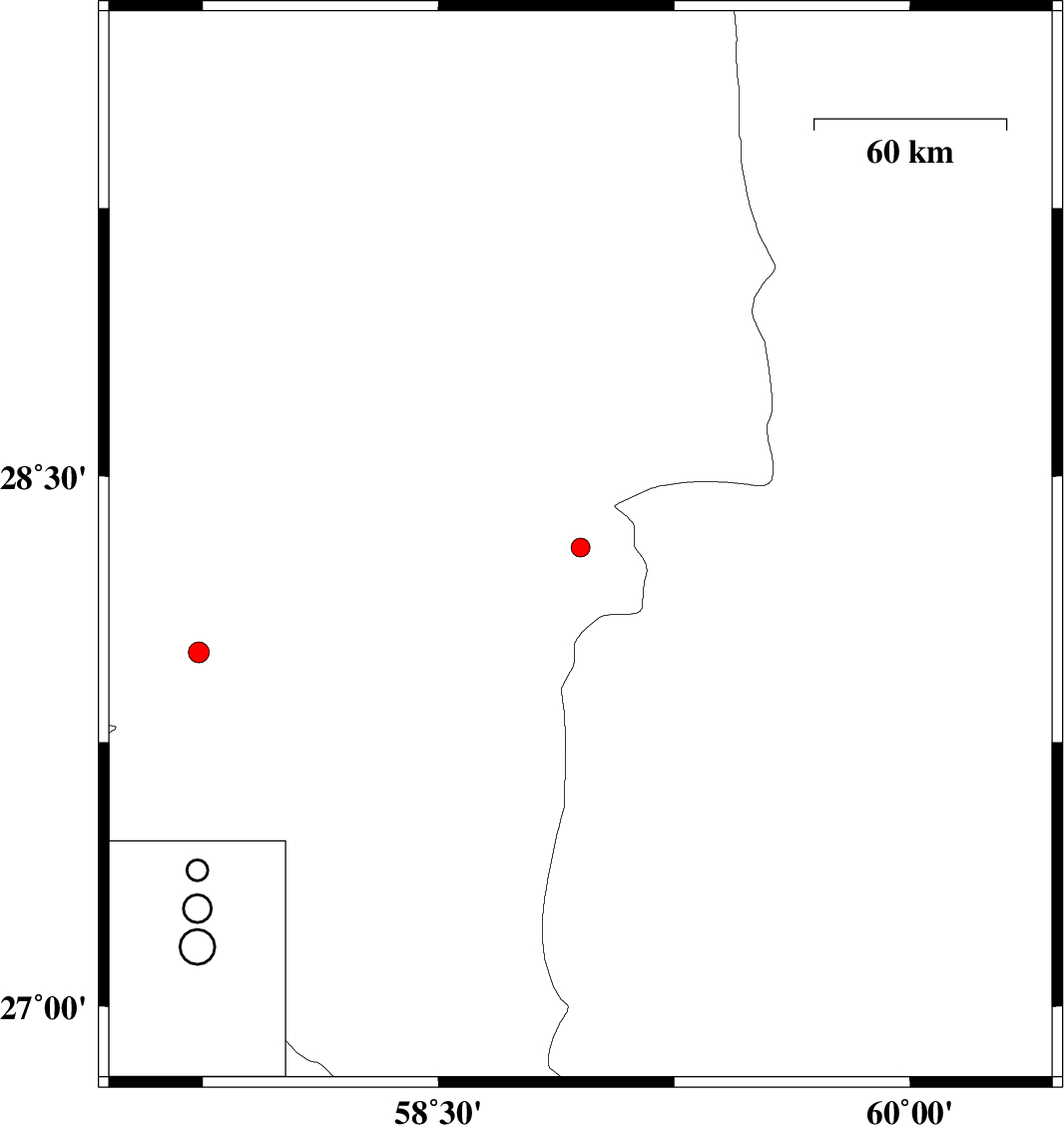 | 2018/02/08 | 16:20:55.4 | 19:50:55.4 | 28.004 | 57.738 | 18 | ML:2.9 | Kerman Province, 7 km of Kahnuj |