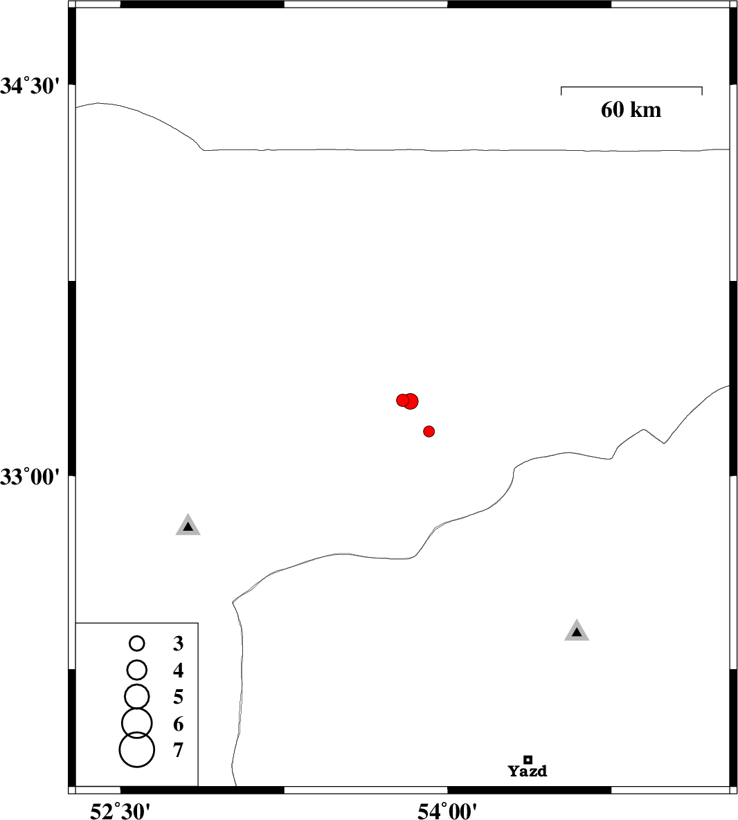 | 2018/02/09 | 23:50:22.0 | 03:20:22.0 | 33.291 | 53.793 | 6 | ML:2.6 | Esfahan Province, 81 km North-East of Nain | ||