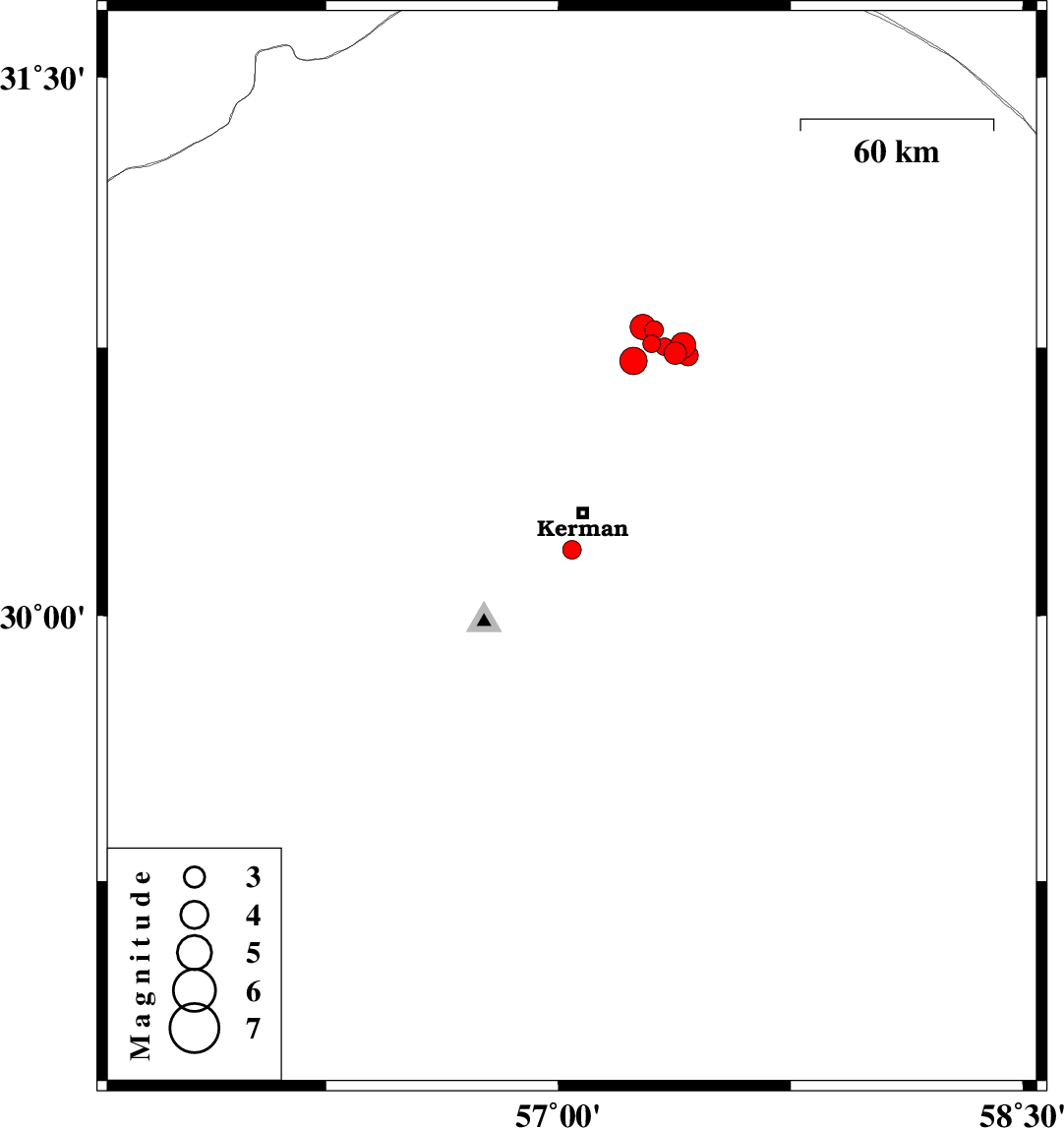| 2018/02/18 | 15:34:13.4 | 19:04:13.4 | 30.799 | 57.31 | 14 | ML:2.7 | Kerman Province, 61 km North-East of Kerman | ||
