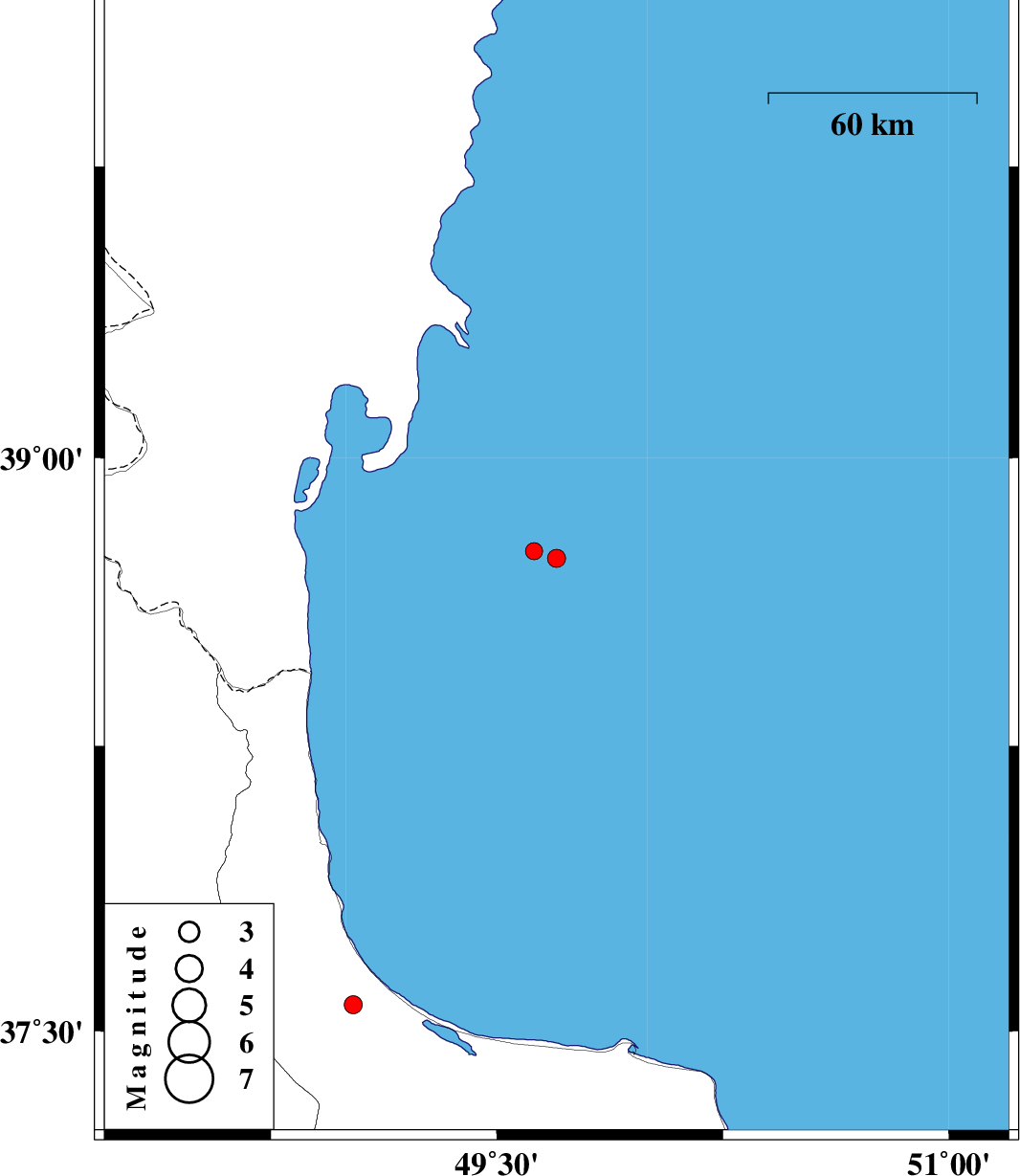 | 2018/03/03 | 17:27:12.4 | 20:57:12.4 | 38.739 | 49.698 | 17 | ML:2.7 | Caspian Sea, 81 km North-East of Astara | ||