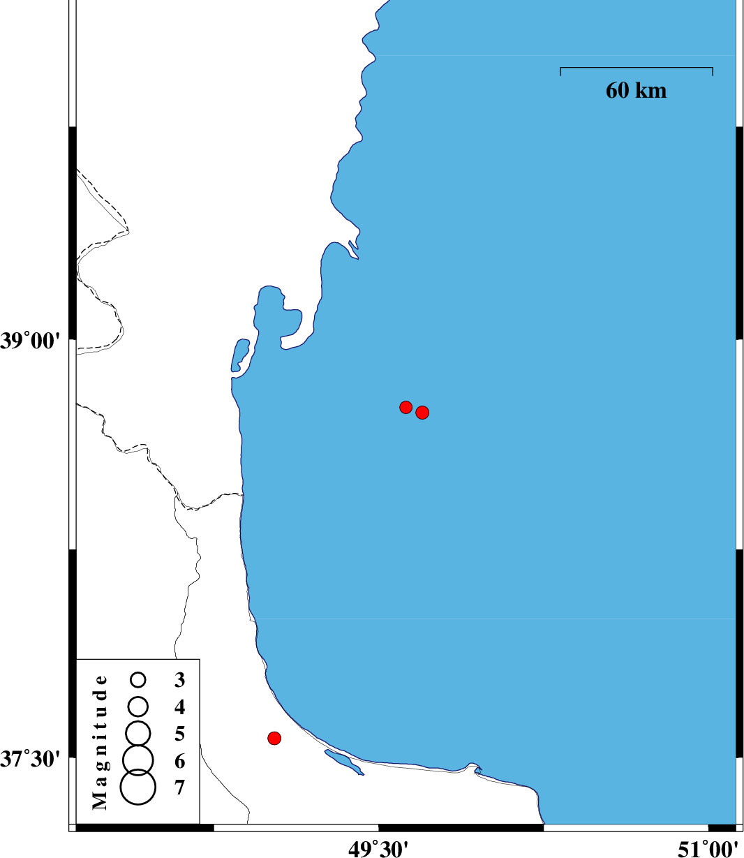 | 2018/03/03 | 17:27:12.4 | 20:57:12.4 | 38.739 | 49.698 | 17 | ML:2.7 | Caspian Sea, 81 km North-East of Astara | ||