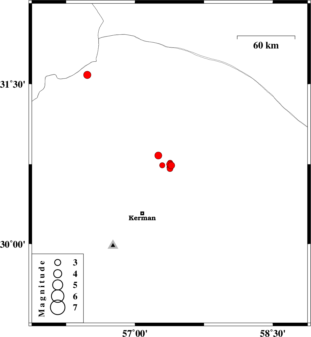 | 2018/02/28 | 06:16:21.9 | 09:46:21.9 | 30.763 | 57.382 | 15 | ML:2.7 | Kerman Province, 60 km North-East of Kerman | ||