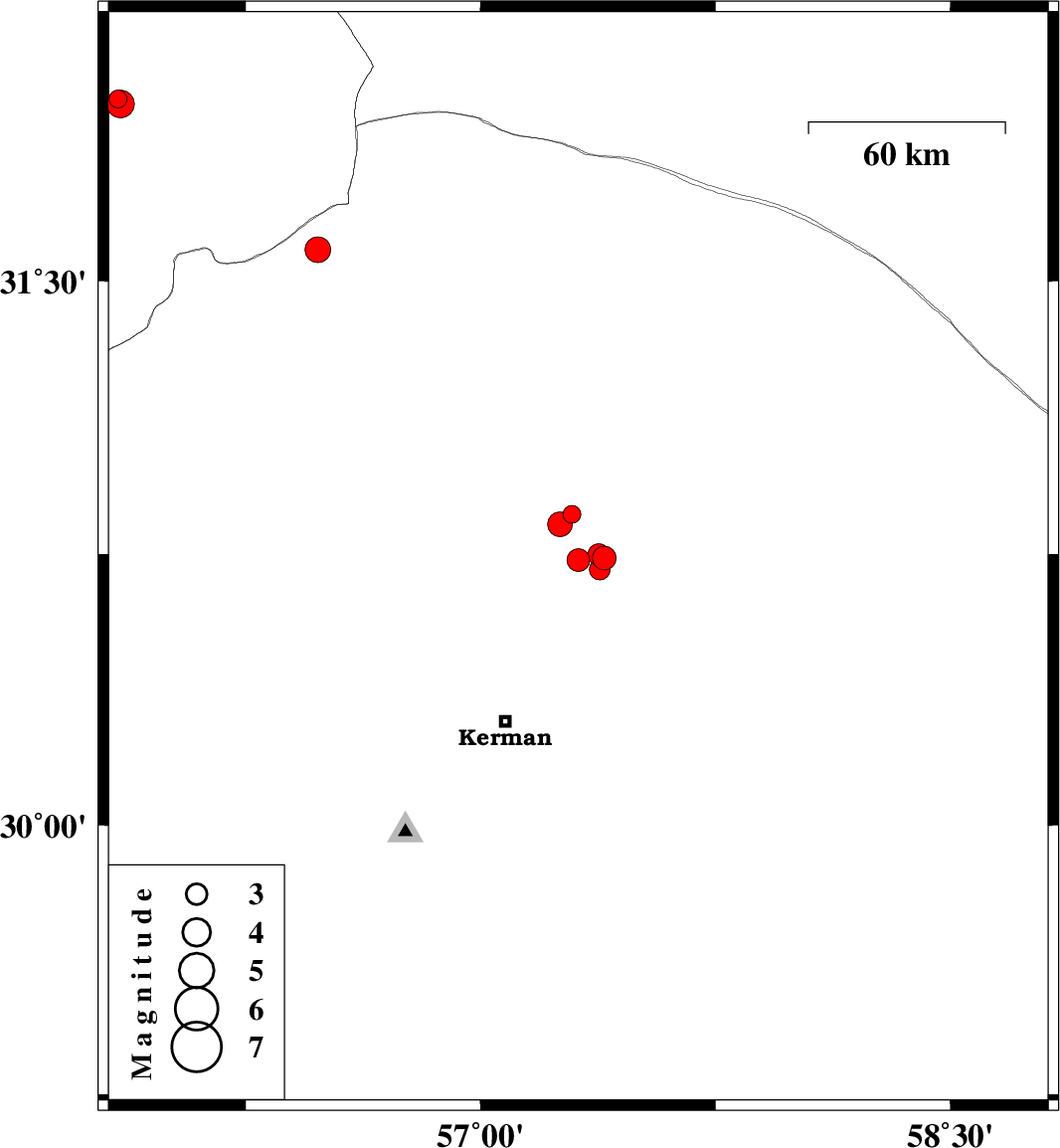 | 2018/03/10 | 15:54:39.5 | 19:24:39.5 | 30.734 | 57.312 | 14 | ML:3.2 | Kerman Province, 54 km North-East of Kerman | ||
