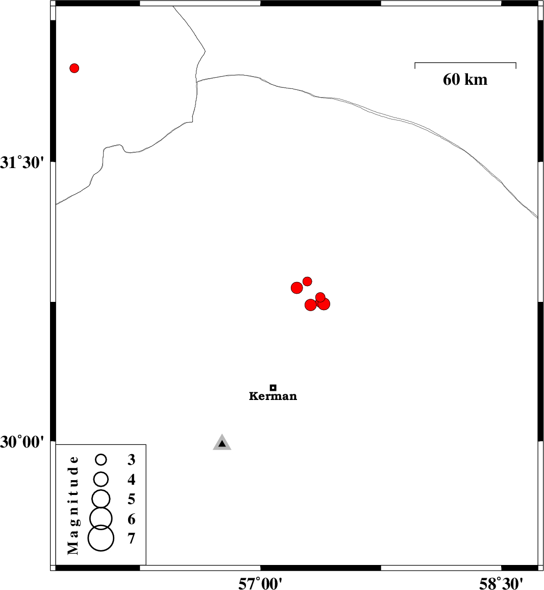 | 2018/03/10 | 15:54:39.5 | 19:24:39.5 | 30.734 | 57.312 | 14 | ML:3.2 | Kerman Province, 54 km North-East of Kerman | ||