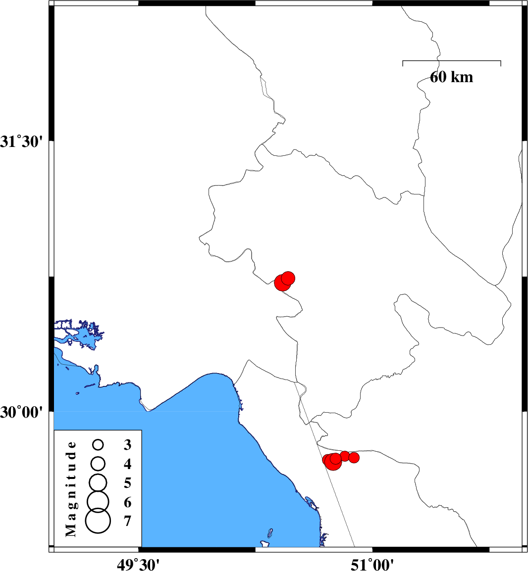 | 2018/03/19 | 06:09:52.0 | 09:39:52.0 | 29.736 | 50.764 | 6 | ML:3.2 | Bushehr Province, 30 km North-East of Bandar-e genaveh | ||