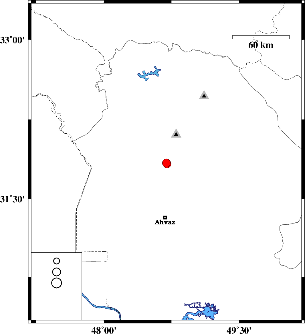 | 2018/03/27 | 23:07:52.4 | 03:37:52.4 | 31.831 | 48.7 | 14 | ML:4.1 | Khoozestan Province, 28 km South-West of Shushtar |
