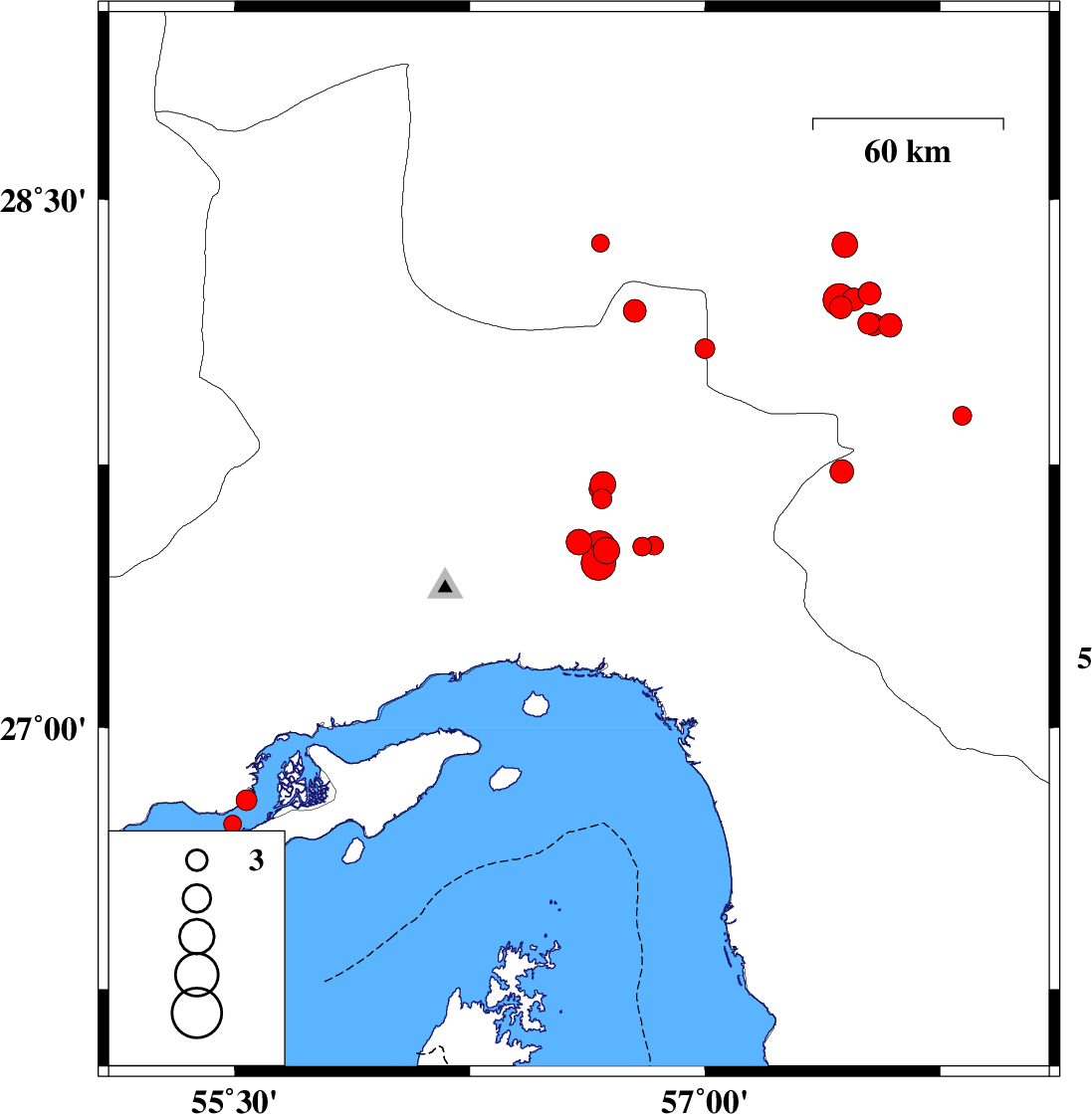 2018/04/04 08:44:34.3 13:14:34.3 27.51756.814 ML:2.7 Hormozgan Province, 45 km -West of Dehbarez