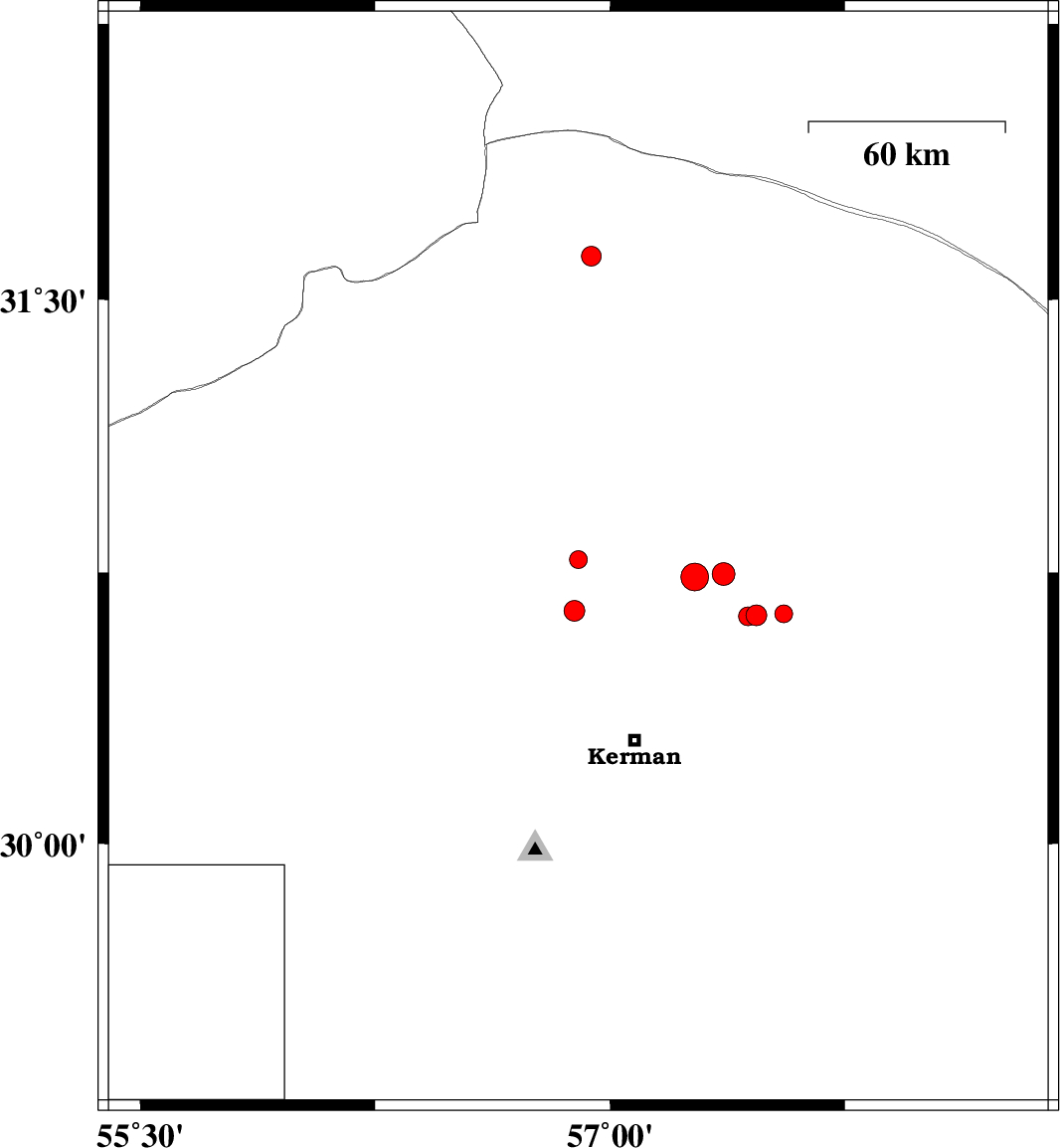 | 2018/04/08 | 06:44:33.6 | 11:14:33.6 | 30.636 | 57.555 | 14 | ML:2.6 | Kerman Province, 60 km North-East of Kerman | ||