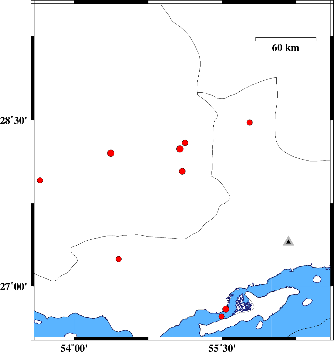 | 2018/04/03 | 22:06:48.2 | 02:36:48.2 | 26.724 | 55.493 | 9 | ML:2.6 | Persian Gulf, 68 km North-East of Bandar-e lengeh | ||