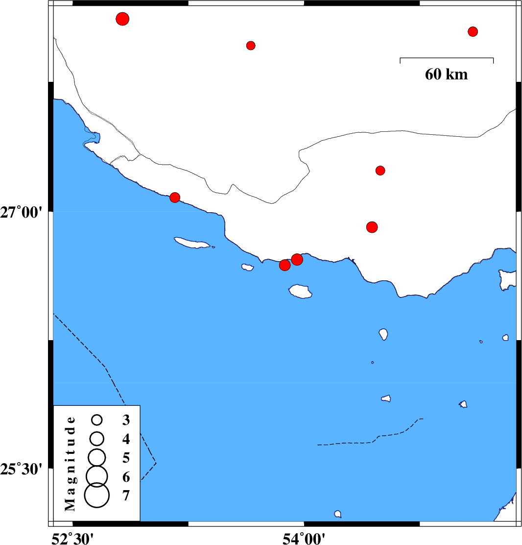 | 2018/04/19 | 23:02:18.2 | 03:32:18.2 | 26.688 | 53.875 | 14 | ML:3.2 | Persian Gulf, 75 km South-West of Bastak | ||