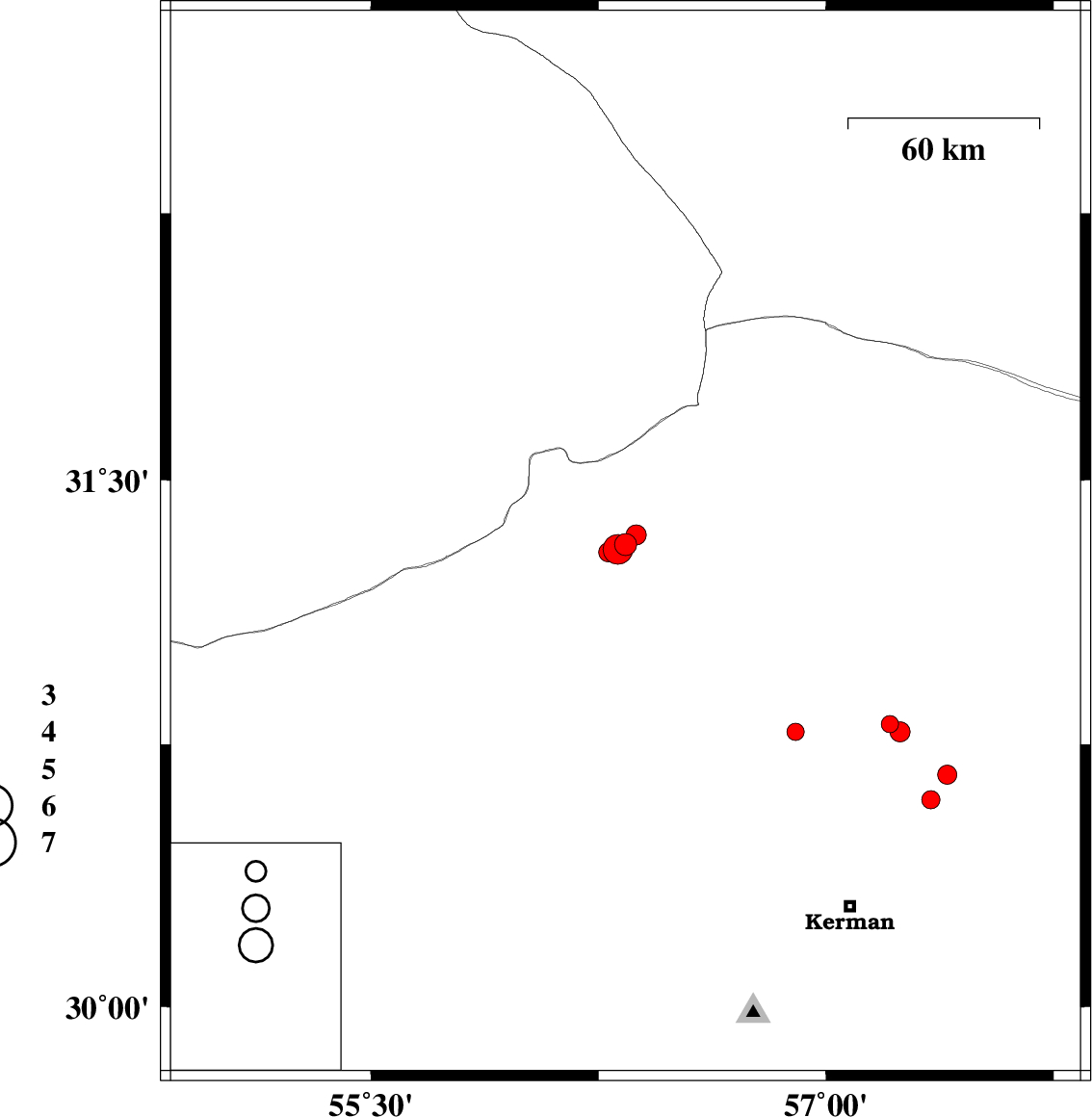 | 2018/04/19 | 05:45:23.9 | 10:15:23.9 | 30.786 | 57.244 | 14 | ML:2.9 | Kerman Province, 58 km North-East of Kerman | ||