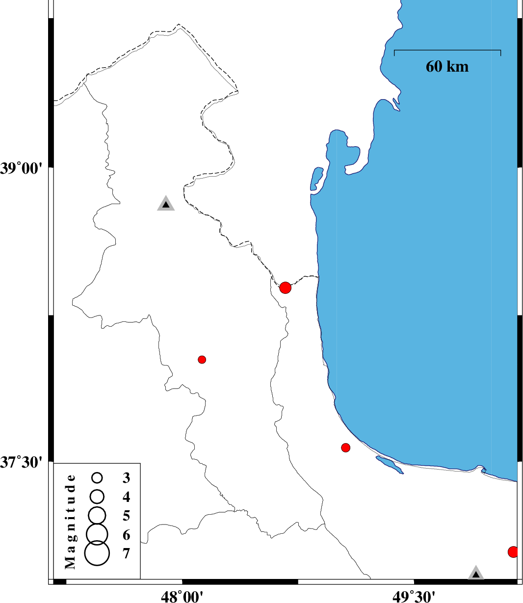 | 2018/04/23 | 13:08:04.1 | 17:38:04.1 | 38.39 | 48.667 | 15 | ML:3.4 | Gilan Province, 17 km -West of Astara | ||