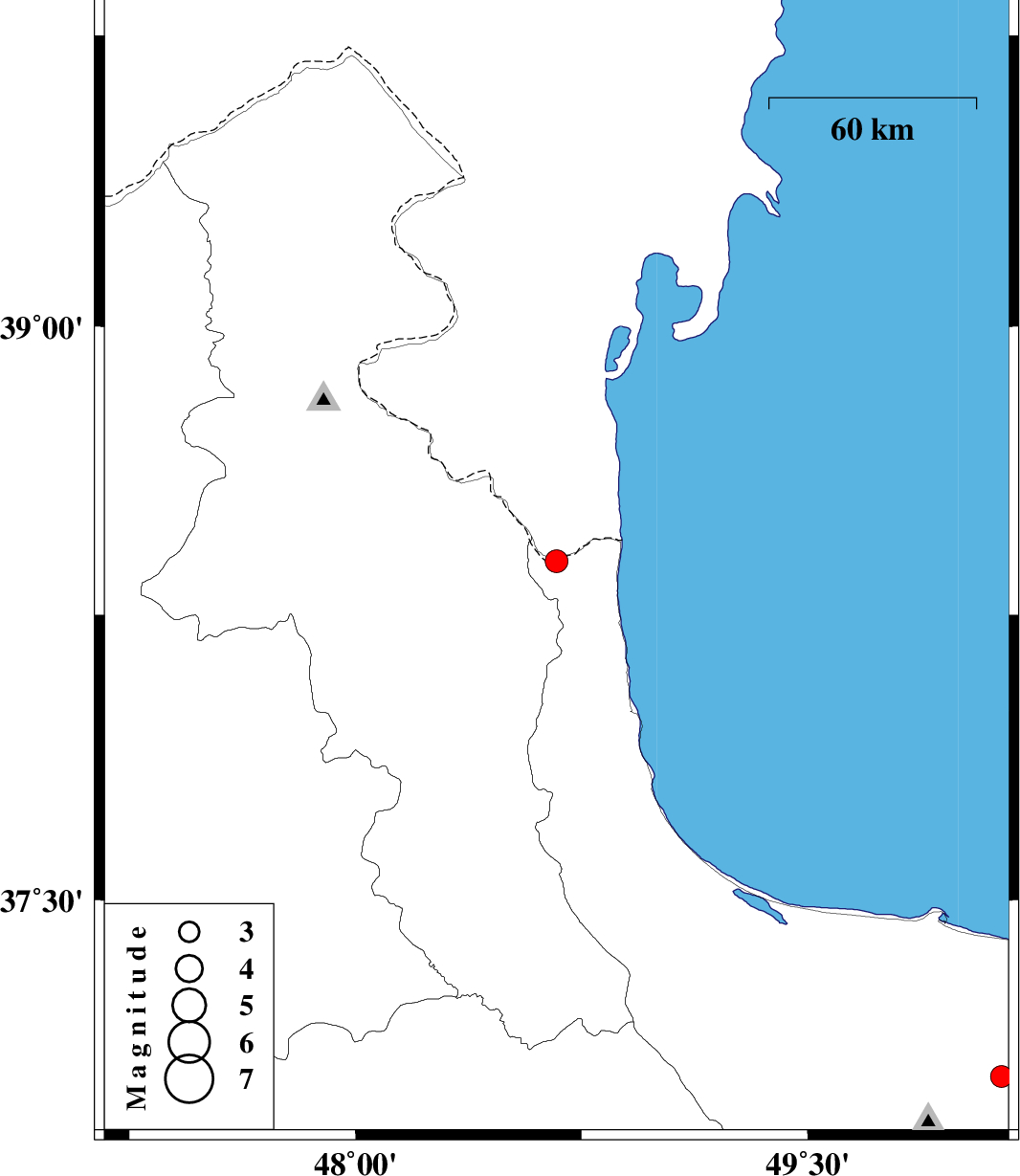 | 2018/04/23 | 13:08:04.1 | 17:38:04.1 | 38.39 | 48.667 | 15 | ML:3.4 | Gilan Province, 17 km -West of Astara | ||