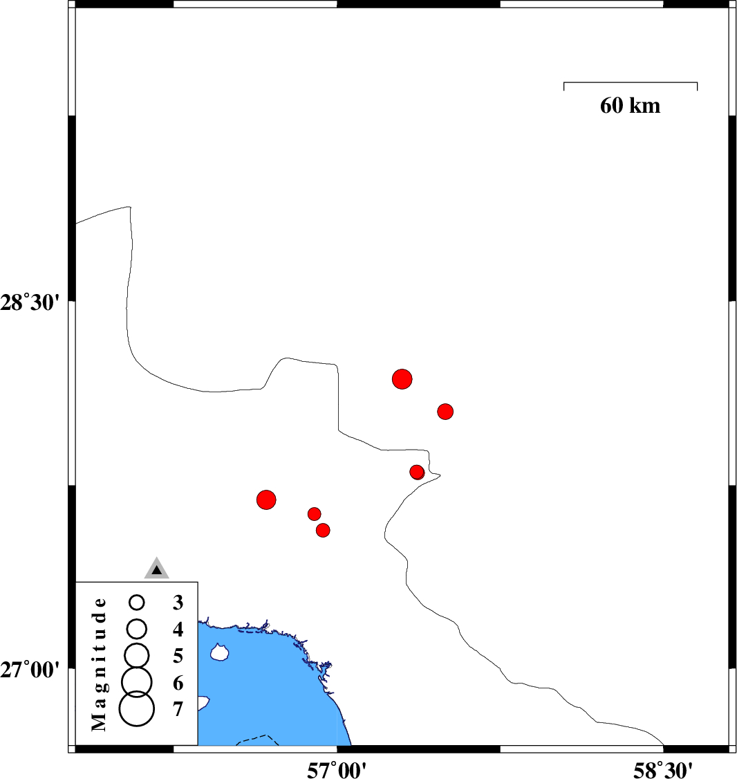 | 2018/04/21 | 03:02:05.0 | 07:32:05.0 | 27.567 | 56.935 | 14 | ML:2.8 | Hormozgan Province, 34 km North-West of Dehbarez | ||