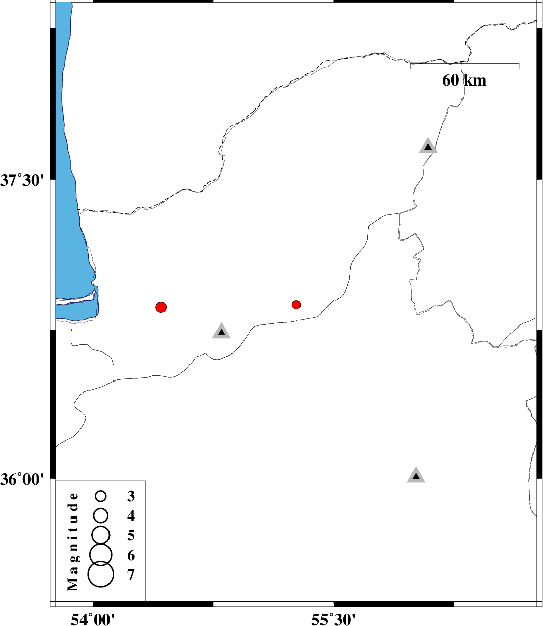 | 2018/04/23 | 22:20:59.3 | 02:50:59.3 | 36.863 | 54.424 | 14 | ML:2.9 | Golestan Province, 3 km of Gorgan |