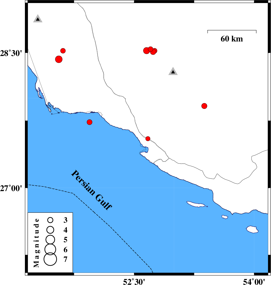 | 2018/05/03 | 06:29:13.3 | 10:59:13.3 | 28.522 | 51.612 | 15 | ML:2.8 | Bushehr Province, 28 km South-East of Khormog | ||