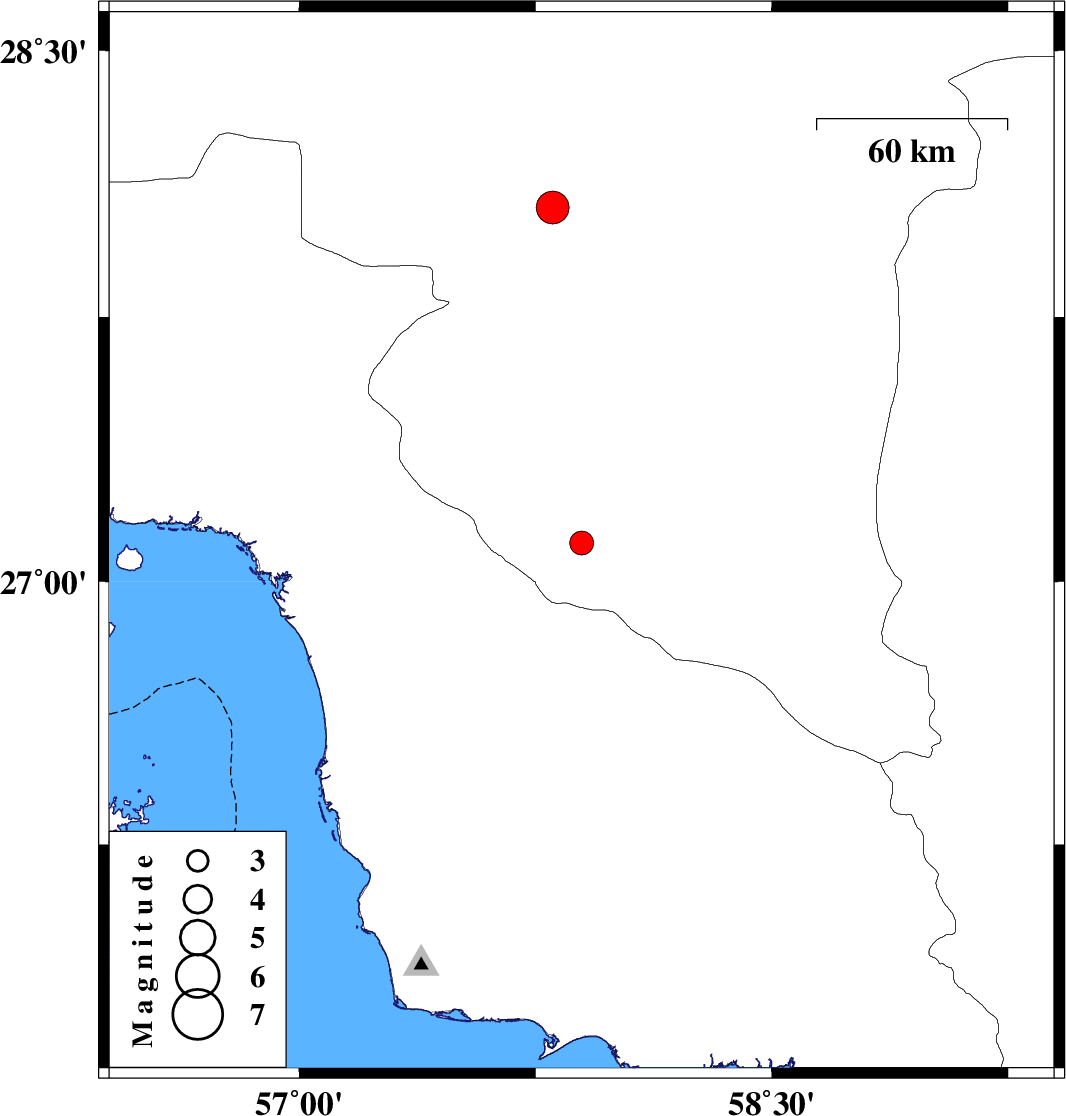 | 2018/05/08 | 18:27:35.2 | 22:57:35.2 | 28.059 | 57.804 | 15 | ML:4.6 | Kerman Province, 16 km North-East of Kahnuj |