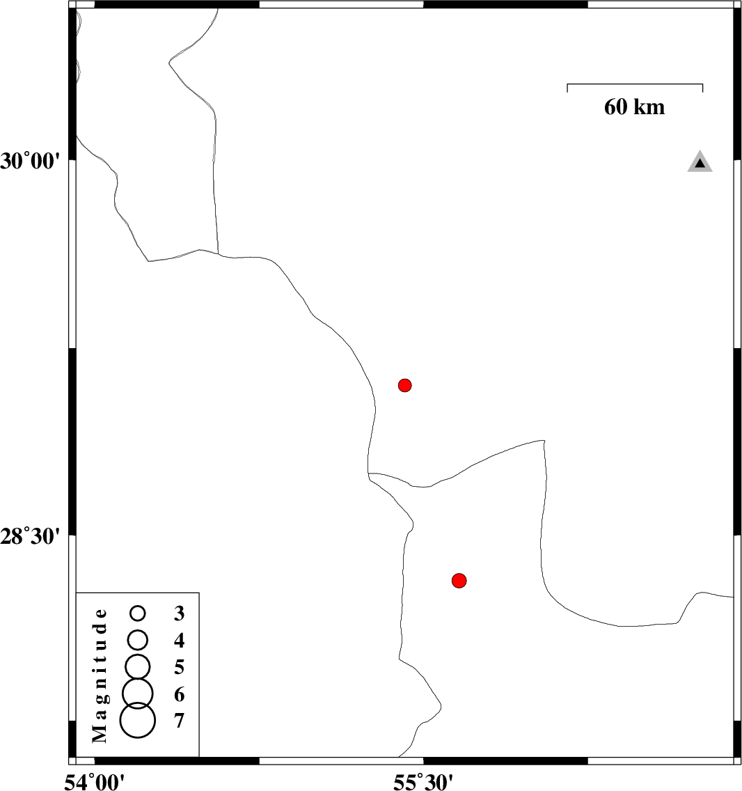 | 2018/05/11 | 10:05:52.3 | 14:35:52.3 | 29.101 | 55.414 | 26 | ML:2.7 | Kerman Province, 46 km South-West of Sirjan |