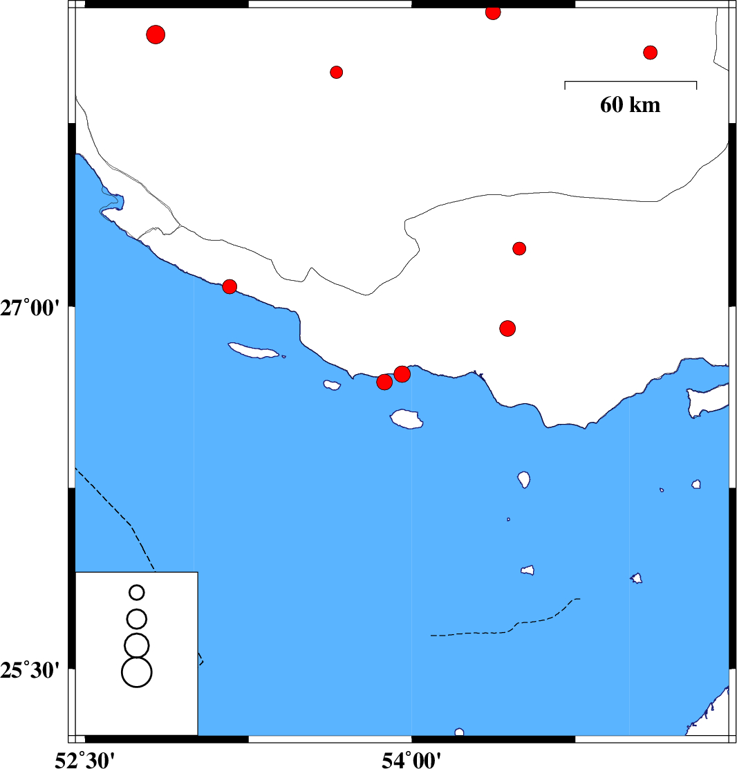| 2018/04/19 | 23:02:18.2 | 03:32:18.2 | 26.688 | 53.875 | 14 | ML:3.2 | Persian Gulf, 75 km South-West of Bastak | ||